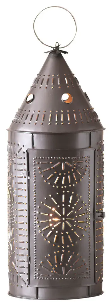 A beautiful lantern that is reminiscent of those original lanterns from centuries ago. Each lantern is handpunched with beautiful details and is electrified.Smokey black finish. Wired with one candelabra socket, 25 watts max. Bulb not included. Line switch on cord. Imported.• Measures 21.5-Inch high and 7.25-Inch diameter• Wired with 1 candelabra socket, 25 watts maximum Line switch on cord• Beautiful punched tin design will illuminate a beautiful pattern across your walls• Traditional Paul Revere design influencesBulbs Not Included