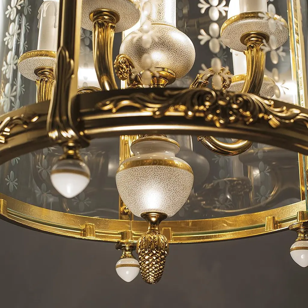 5-lights Lantern in white porcelain with pure gold decorations and white silk and gold patinated bronze. The glasses are engraved by hand. Each object is handcrafted and the care for every detail makes each item unique in its kind. The style of this chandelier is a modern reinterpretation of chandelier from the second half of the 18th century in France. This items was made entirely in Italy. At the customer's request, this item can be customized, can be made in different metal finishing: french gold, patinated silver, burnished and dark burnished and the color of crystal.Also Oggetti d'Arte will follow with the same passion the request of the most qualified studies of interior architecture from around the world, helping them in achievement of their most ambitious projects.This chandelier needs 5 bulb max 40 watt E14.