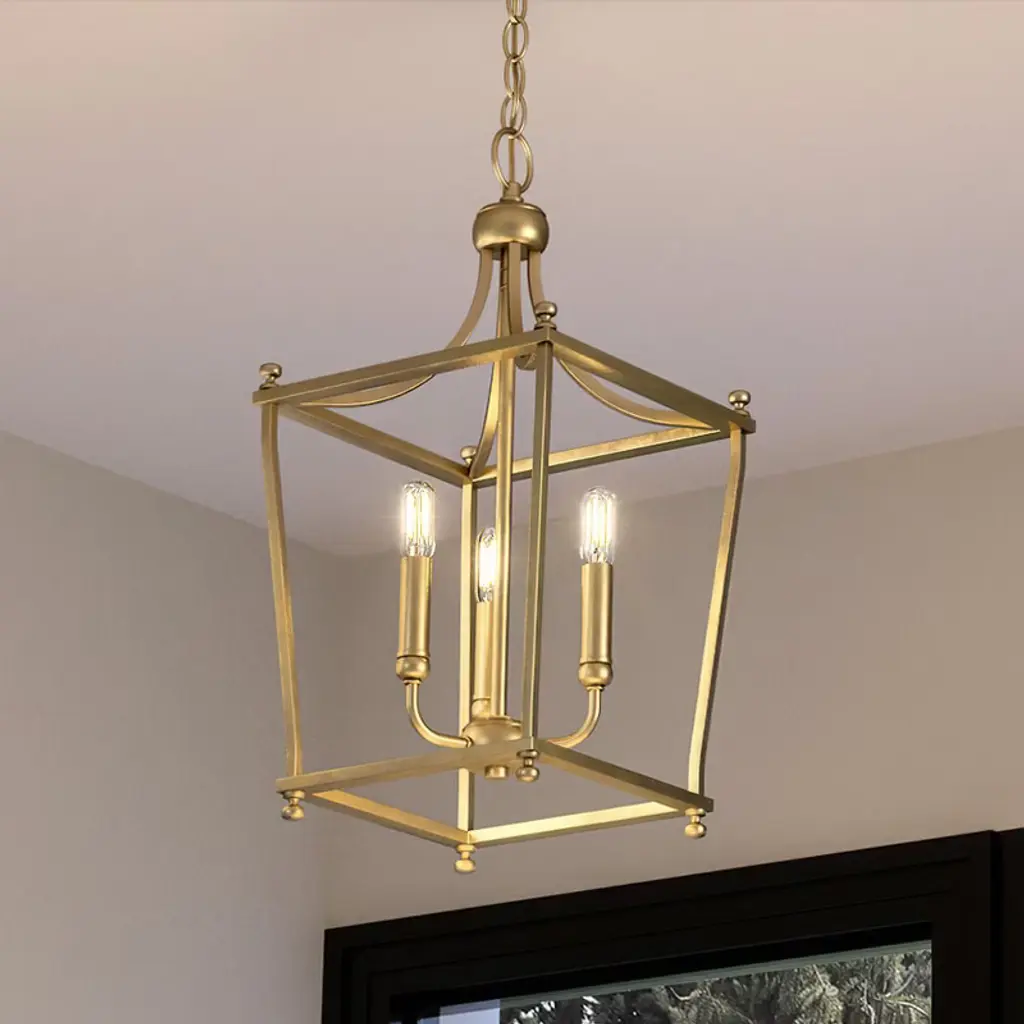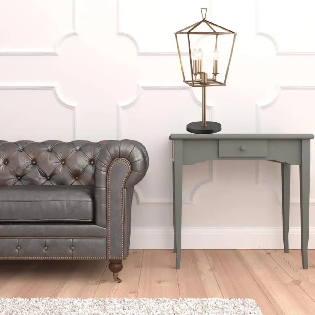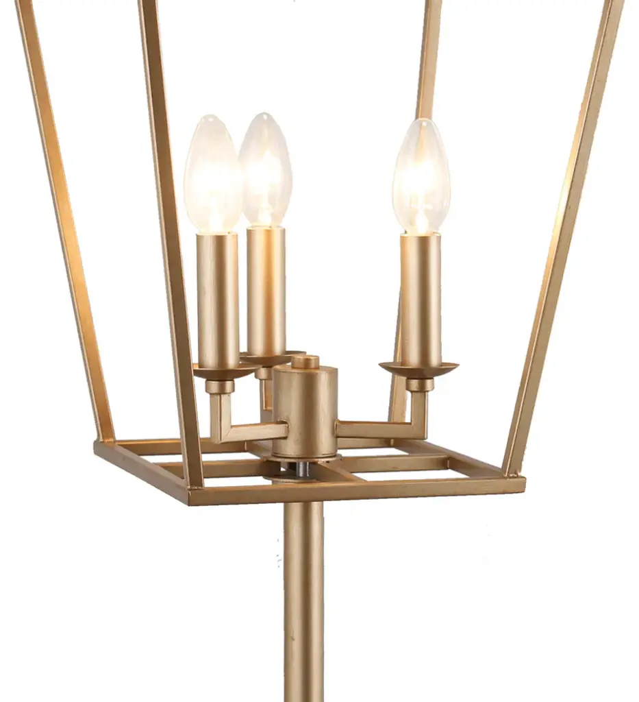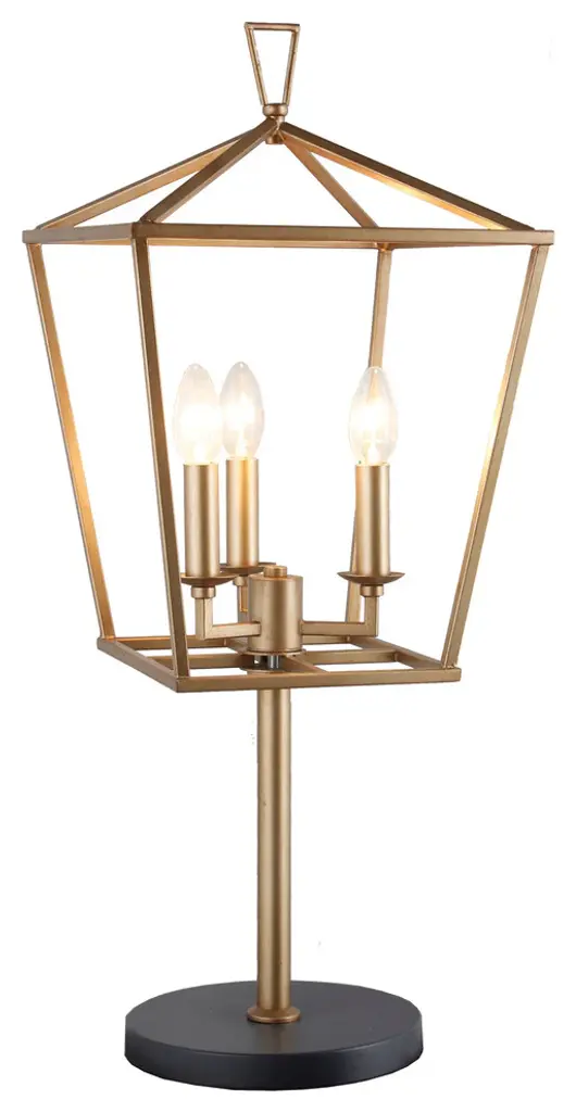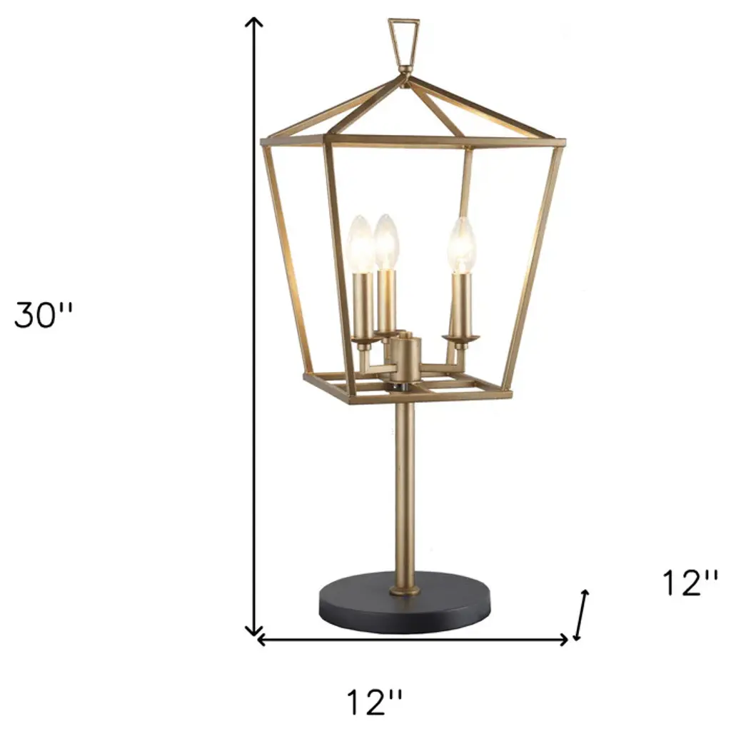 With this 30" black and gold three light lantern design table lamp you can bring in design to any space along with adding some ambient lighting. A gorgeous black iron base features a gold lantern cage style framing that holds three chandelier style lights for a unique designer look. Table lamps help to add a soft and cozy glow to your bedroom, living room or office. Great for evening reading! High quality design makes this a great lamp for not only lighting, but accenting a room with style. 30" H x 12" W x 12" D