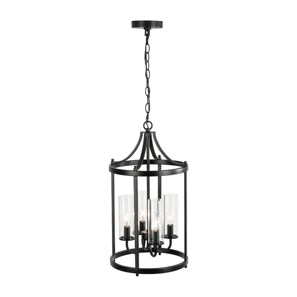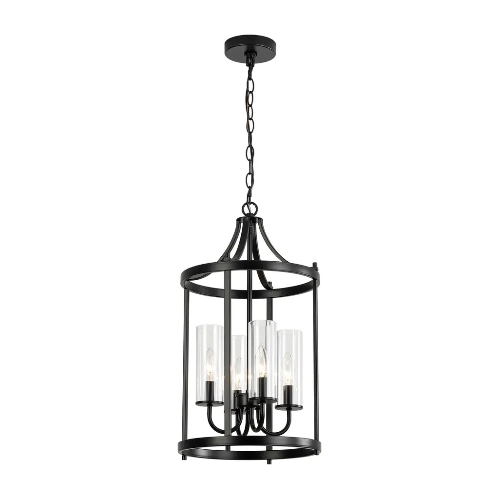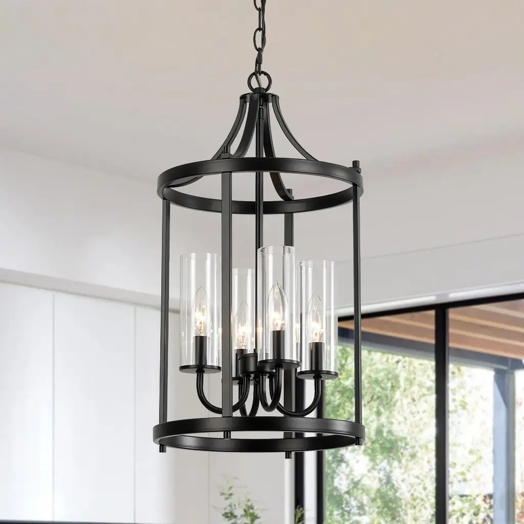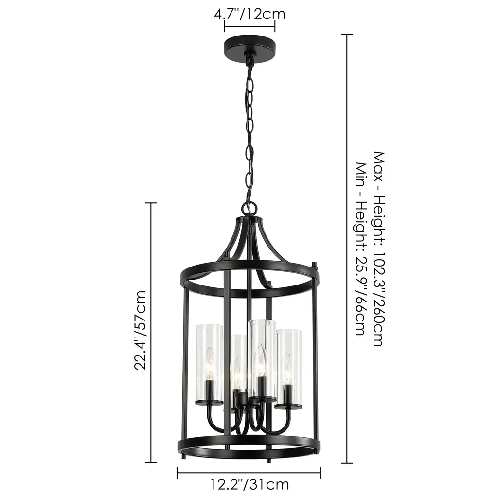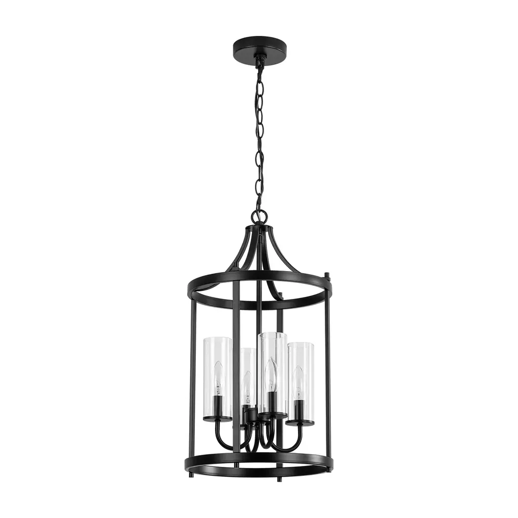 Elevate your space with this elegant 4-light black lantern pendant light. Featuring a traditional drum shape with clear glass shades, this fixture combines classic design with modern functionality. The sleek black finish complements the transparency of the glass, allowing ample light to illuminate your kitchen island, dining area, or living room with a warm, inviting glow. Adjustable height and dimmable compatibility ensure that you can customize the ambiance to suit your needs. Features: Dimensions: (see image gallery for dimensional drawing)