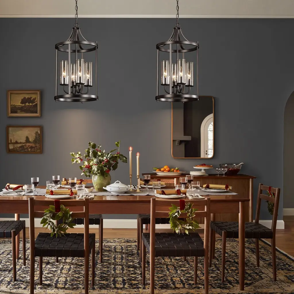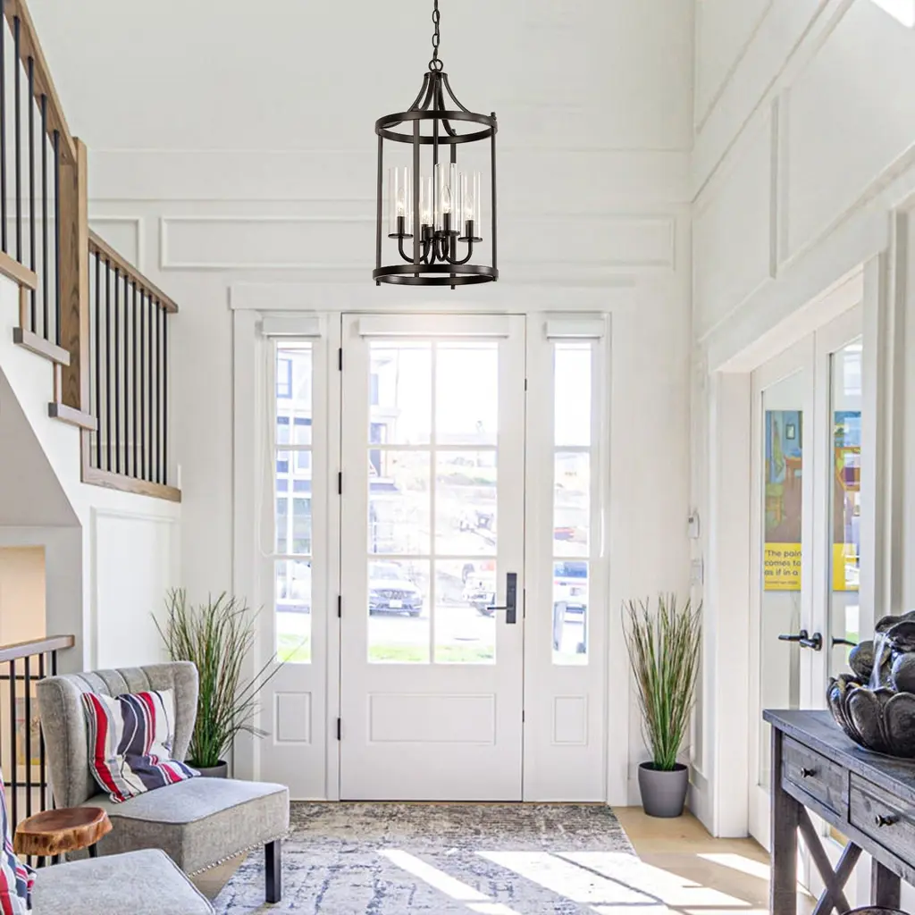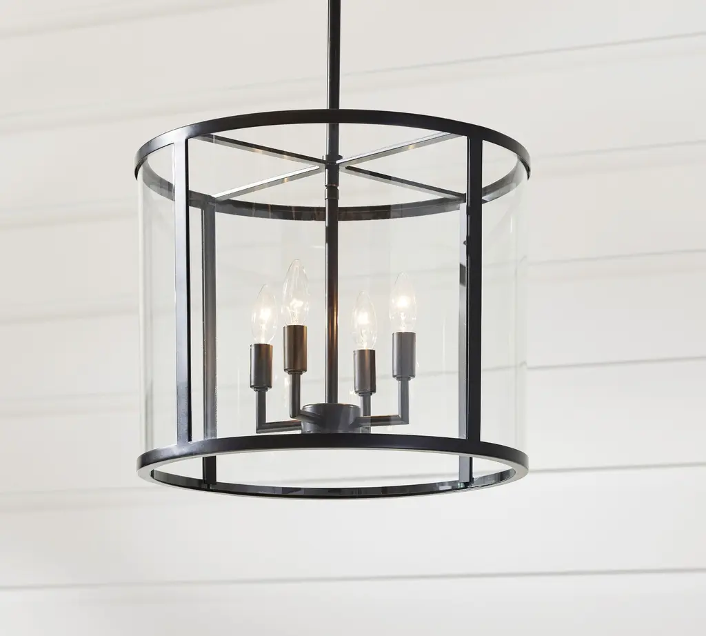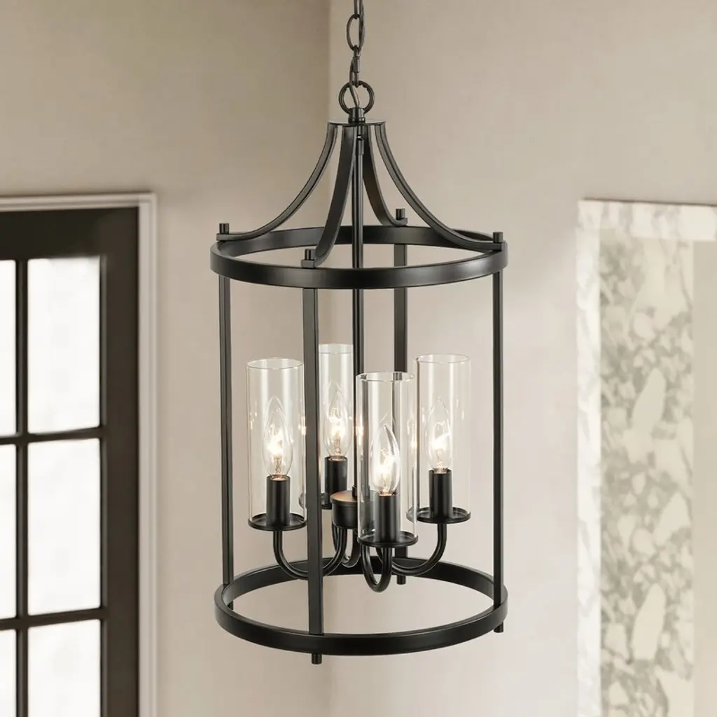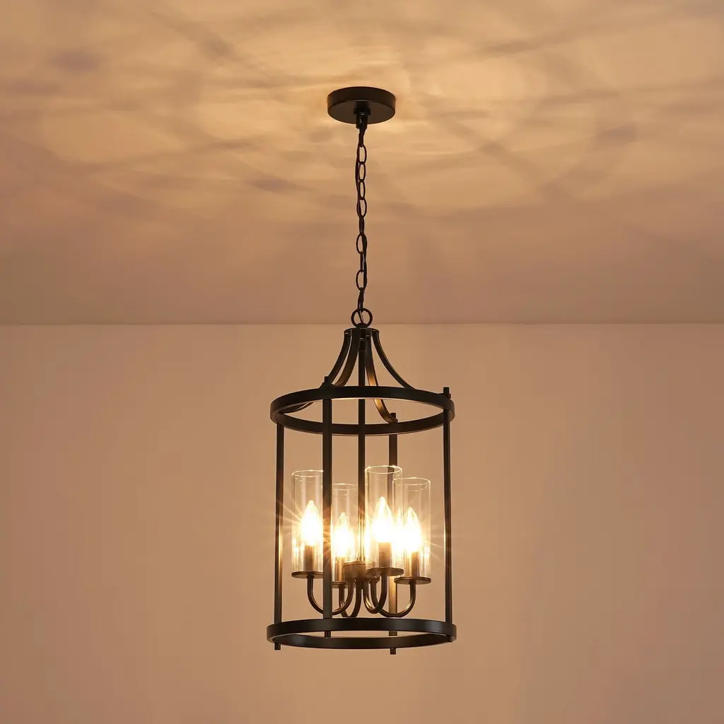 Elevate your space with this elegant 4-light black lantern pendant light. Featuring a traditional drum shape with clear glass shades, this fixture combines classic design with modern functionality. The sleek black finish complements the transparency of the glass, allowing ample light to illuminate your kitchen island, dining area, or living room with a warm, inviting glow. Adjustable height and dimmable compatibility ensure that you can customize the ambiance to suit your needs. Features: Dimensions: (see image gallery for dimensional drawing)
