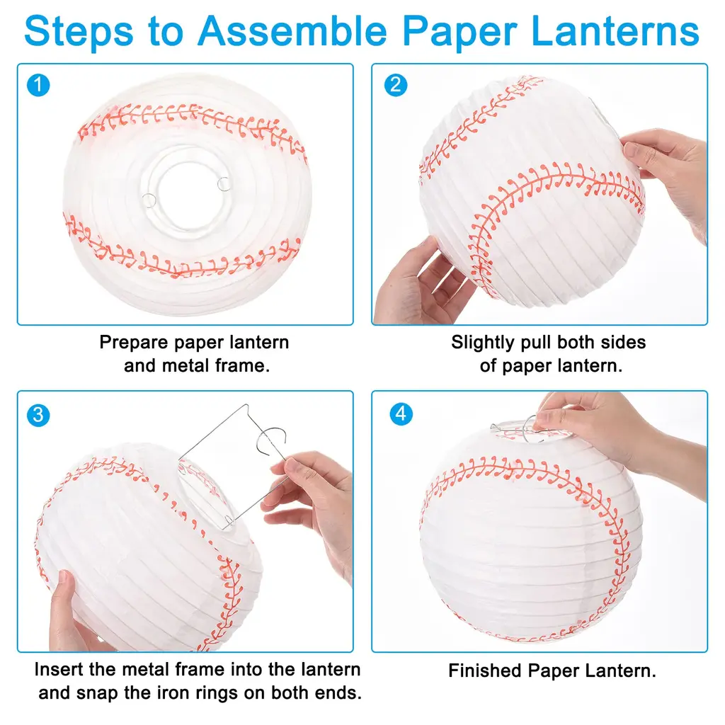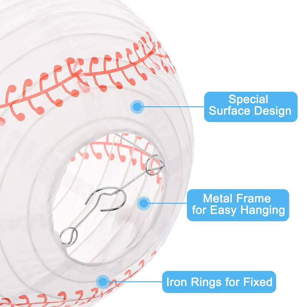 Without losing simplicity and sophistication, our paper lanterns provide a stylish and artistic decorative project. Widely used at party occasions, such as birthdays, weddings, bridal showers, theme parties, family gatherings, bachelorette parties, engagement parties, new years' parties, Christmas parties, anniversary, graduations, garden decorations, room decor, Easter basket stuffer, etc.SpecificationMaterial: Paper, MetalShape: BaseballColor: WhiteDiameter: 20cm/ 8inchPackage List: 6Pcs x Paper Lanterns, 6Pcs x InstructionsAdvantageOur paper lantern is made of quality paper, with a foldable design, can be reusable and easily stored. Easy to assemble and disassemble, comes with a sturdy hanging frame, you can hang the paper lanterns anywhere you want to decorate by using the hanging frame. Distinctive design of our paper lanterns makes decorations more stand to add party atmosphere.InstructionNot only can you paint on the paper lanterns and add your favorite elements, but you can also use them with LED lights or other lights, and hang them from the ceiling, wall, window, door, or branch to create a cheerful party atmosphere. Also, you can DIY them according to your imagination, creating unique handicrafts.NOTEPlease do not be rough when using it and avoid contacting the paper garlands with water.