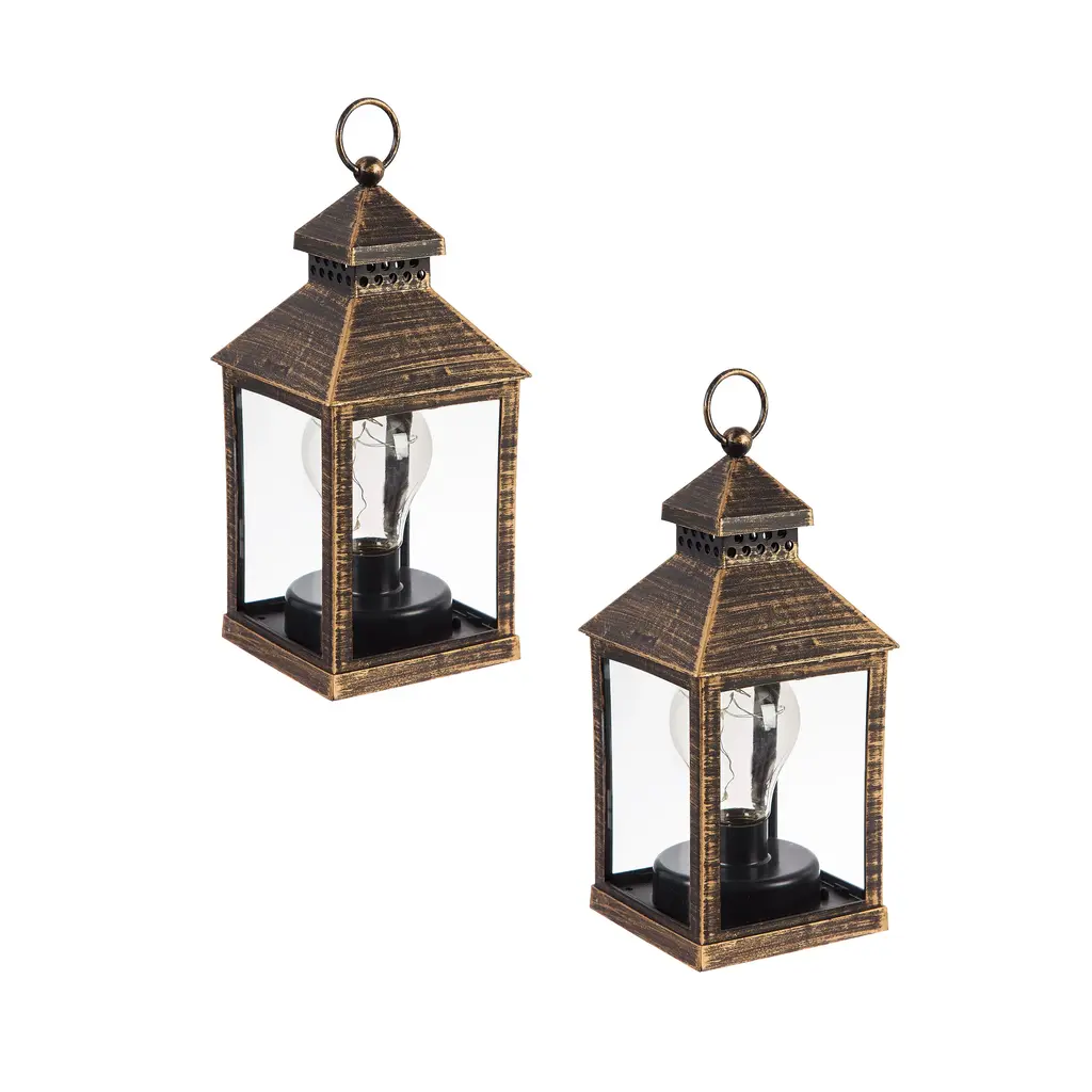 8.5"h Battery Operated Twinkling Light Bulb Lantern, Black With Brushed Gold, Set Of 2
