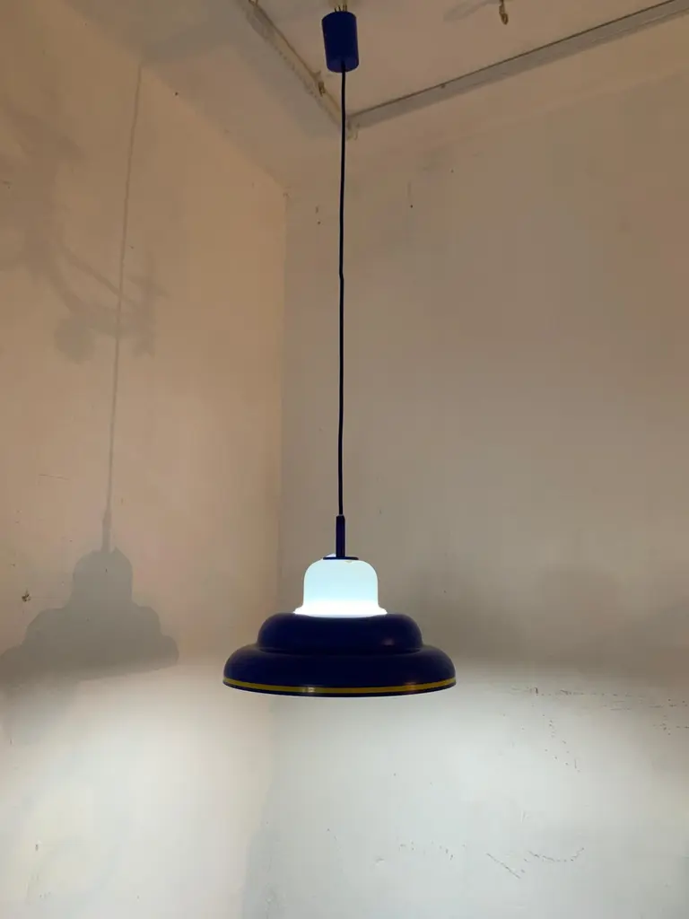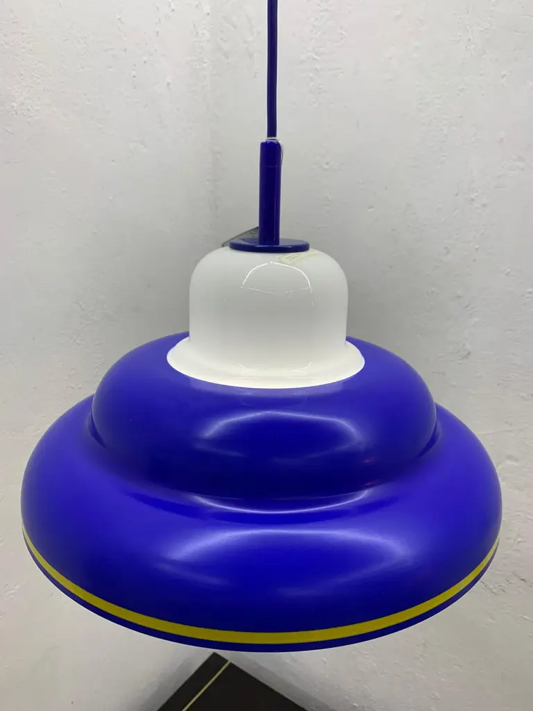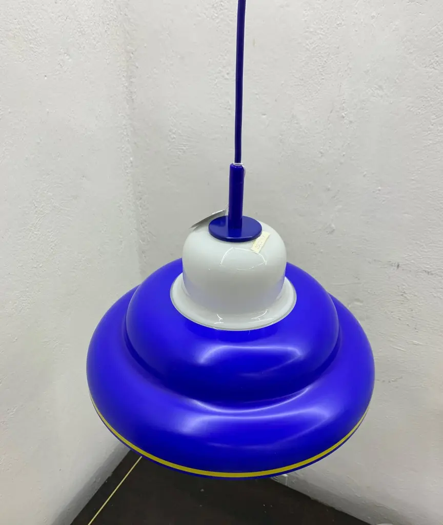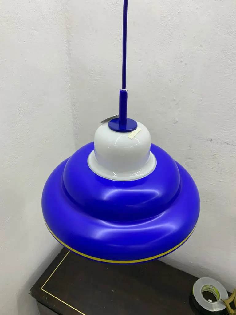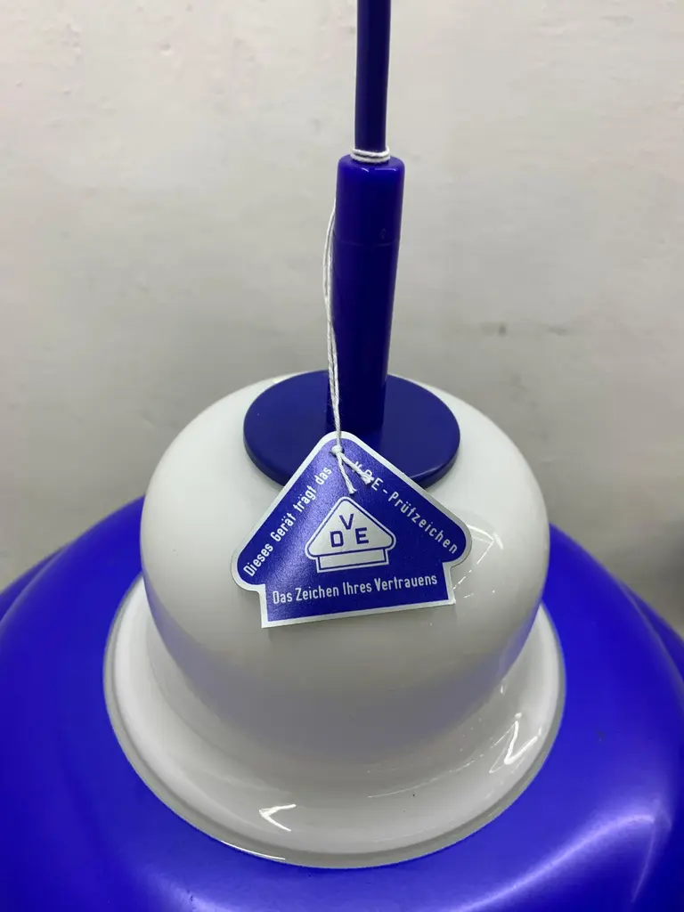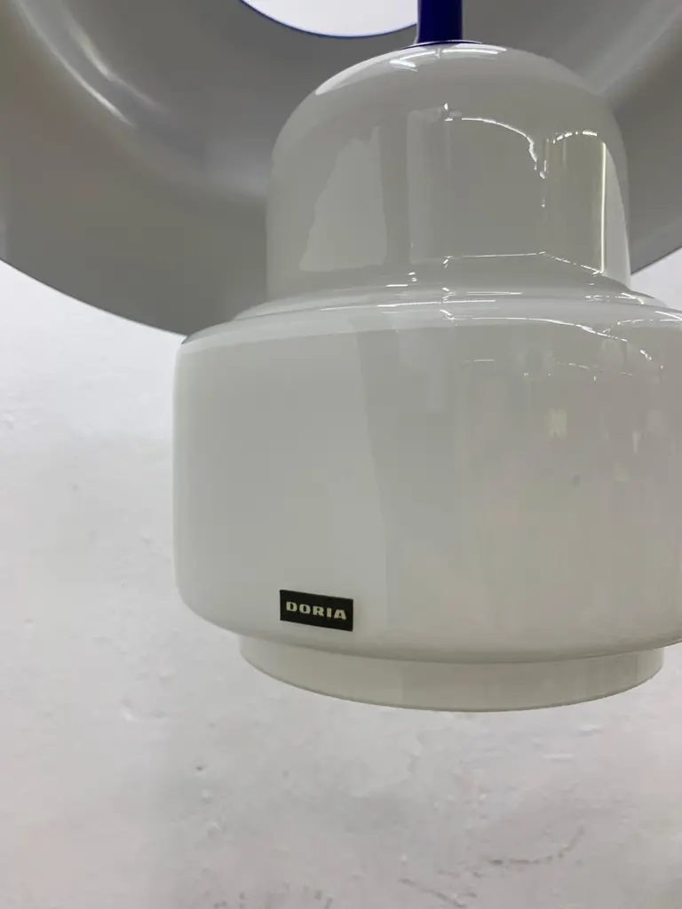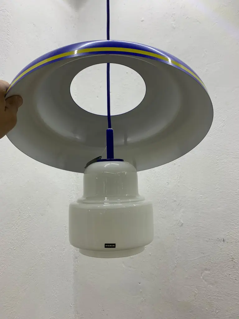 Set of 8 chandeliers or lanterns manufactured by Doria Leuchten in Germany in opaline glass and blue and yellow lacquered metal,circa 1970sUnused and still holding the original tags, the height is easily adjustable up to a 120cm drop.Priced individually.