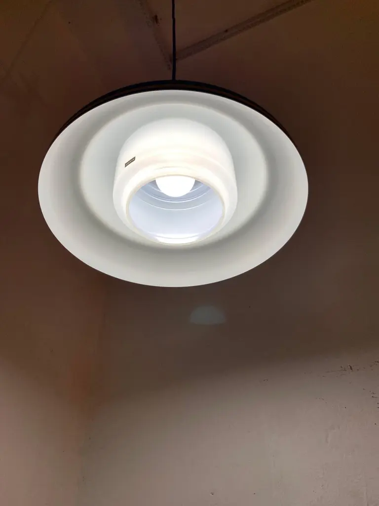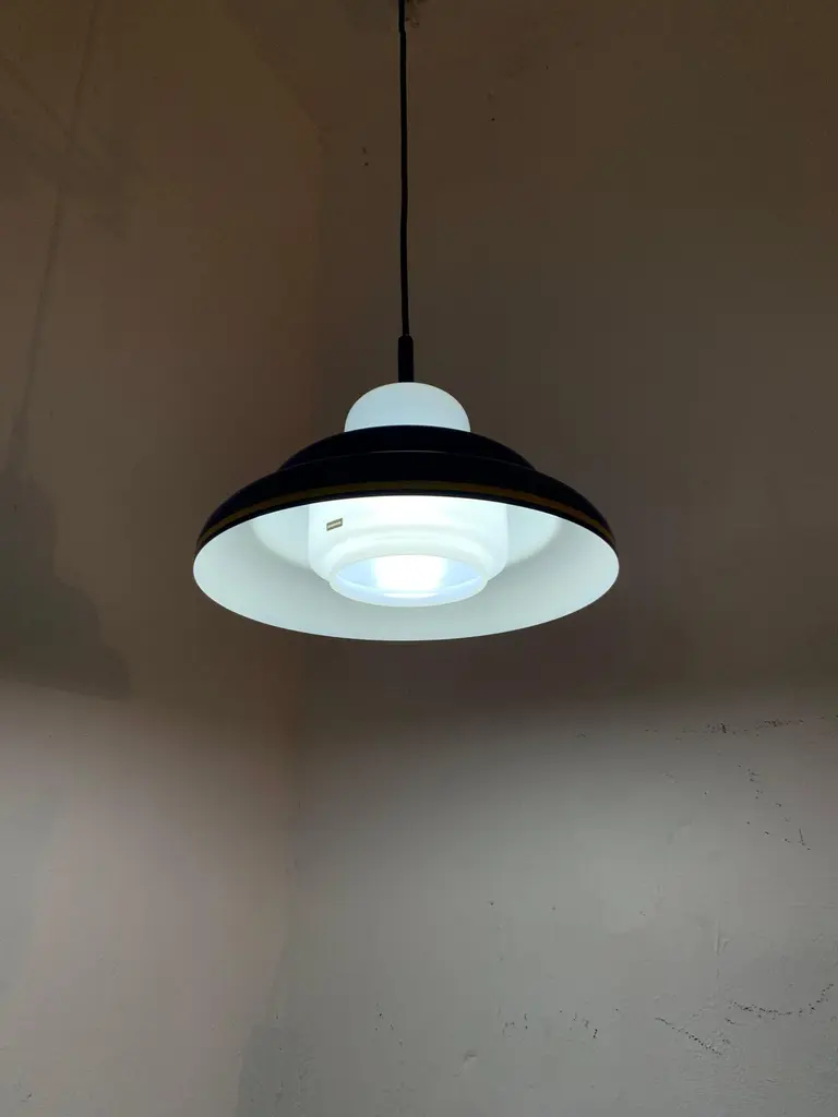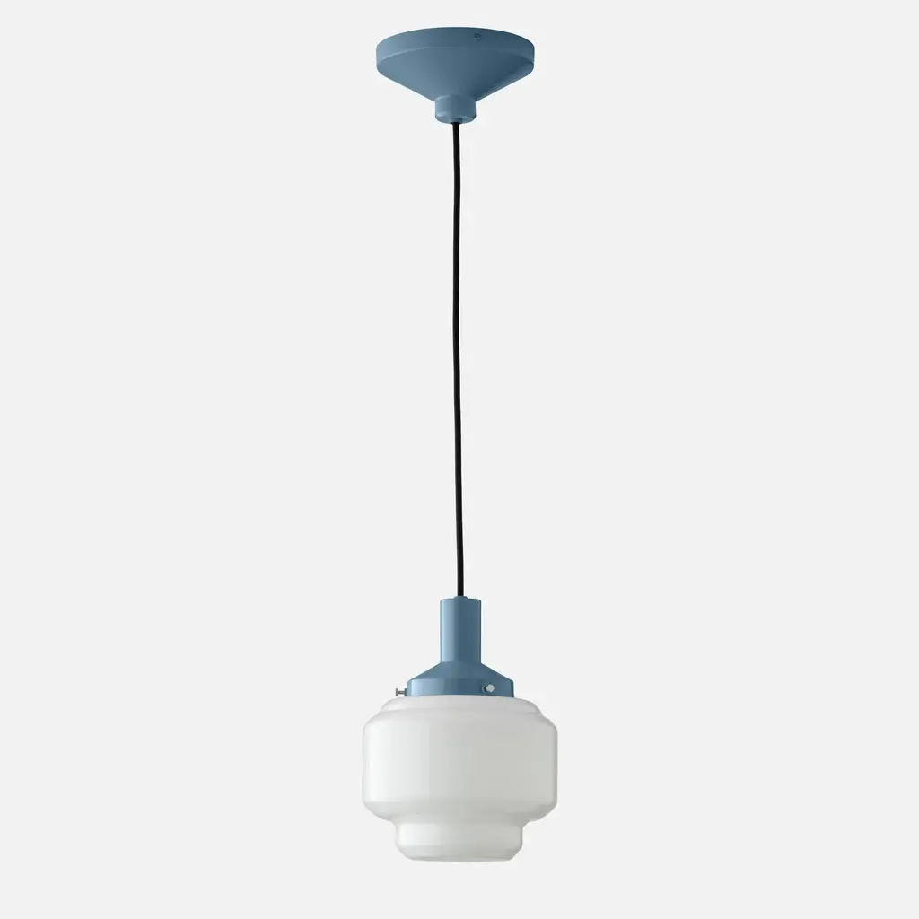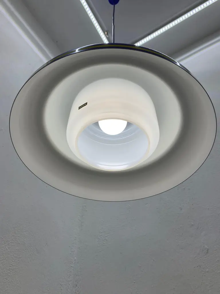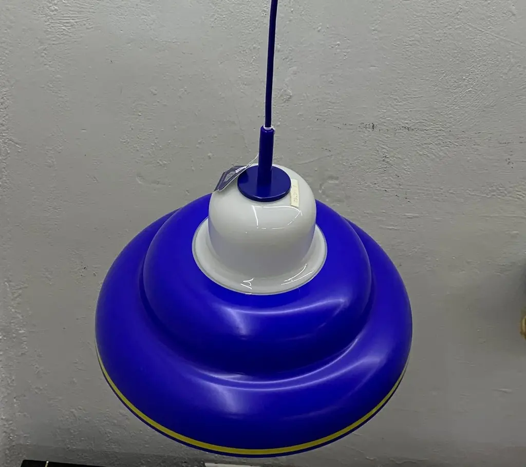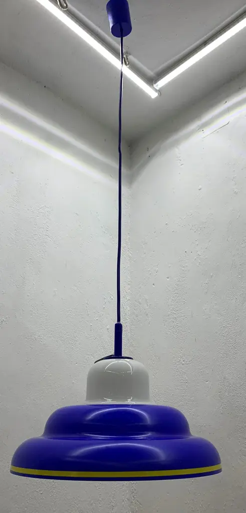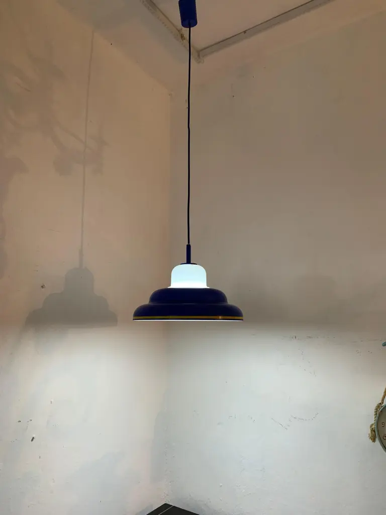 Set of 8 chandeliers or lanterns manufactured by Doria Leuchten in Germany in opaline glass and blue and yellow lacquered metal,circa 1970sUnused and still holding the original tags, the height is easily adjustable up to a 120cm drop.Priced individually.