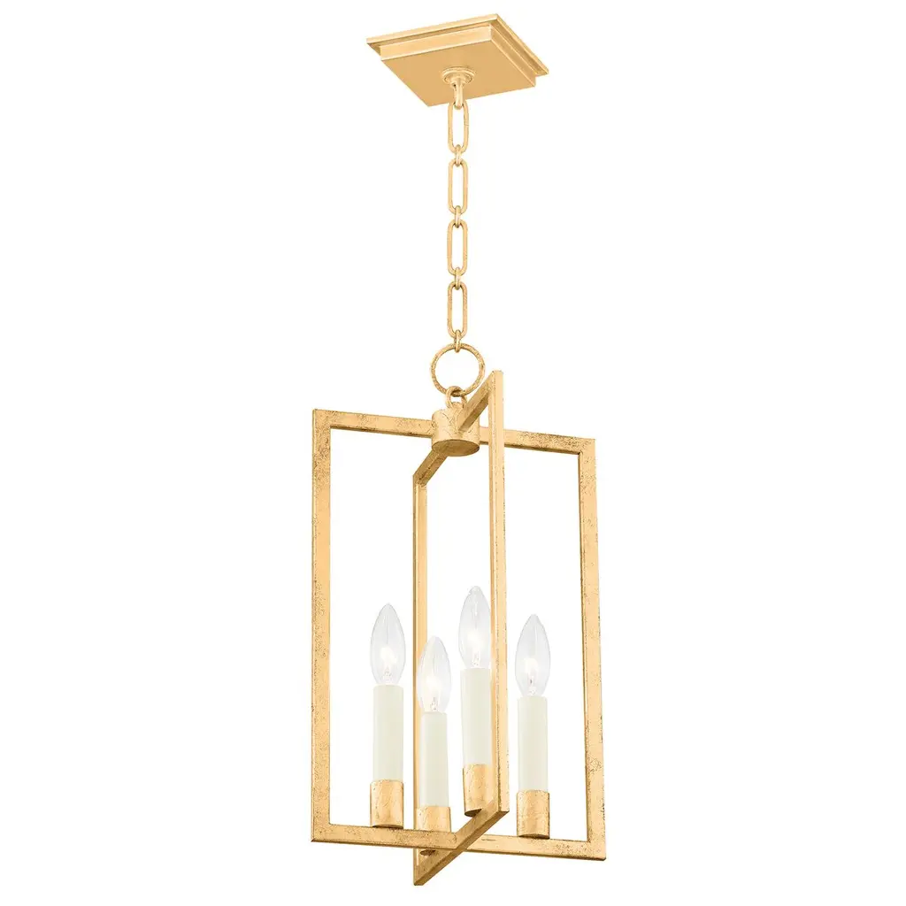 Vintage meets modern in Adelaide's romantic form. This 4-light lantern features a twisted metal frame in a textured black or vintage gold leaf finish. Circular forms near the top and bottom of the frame offset the clean edges, lending balance to the design. Candelabra style sockets reference antique design yet feel quite contemporary when paired with modern bulbs. Also available in a smaller size.