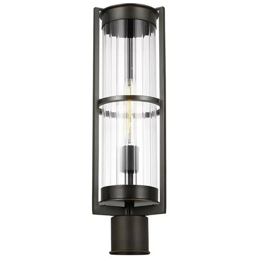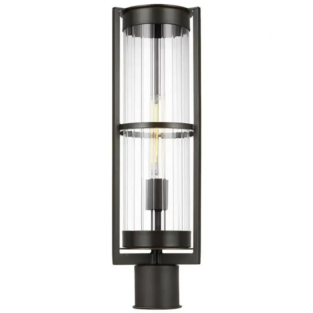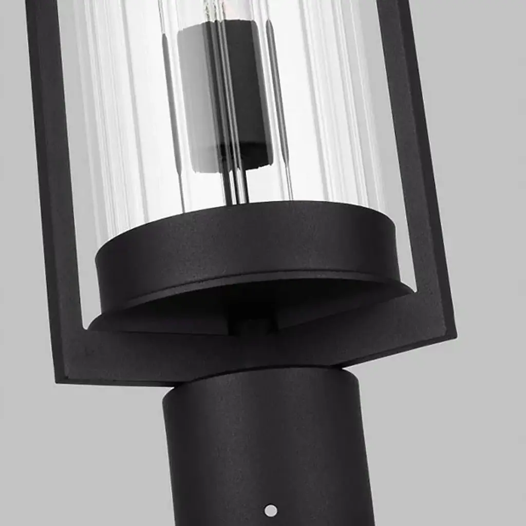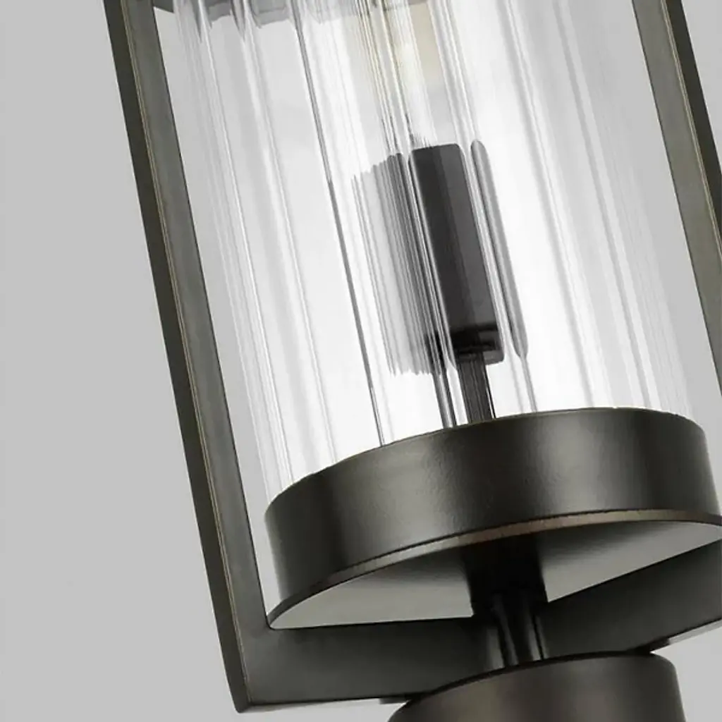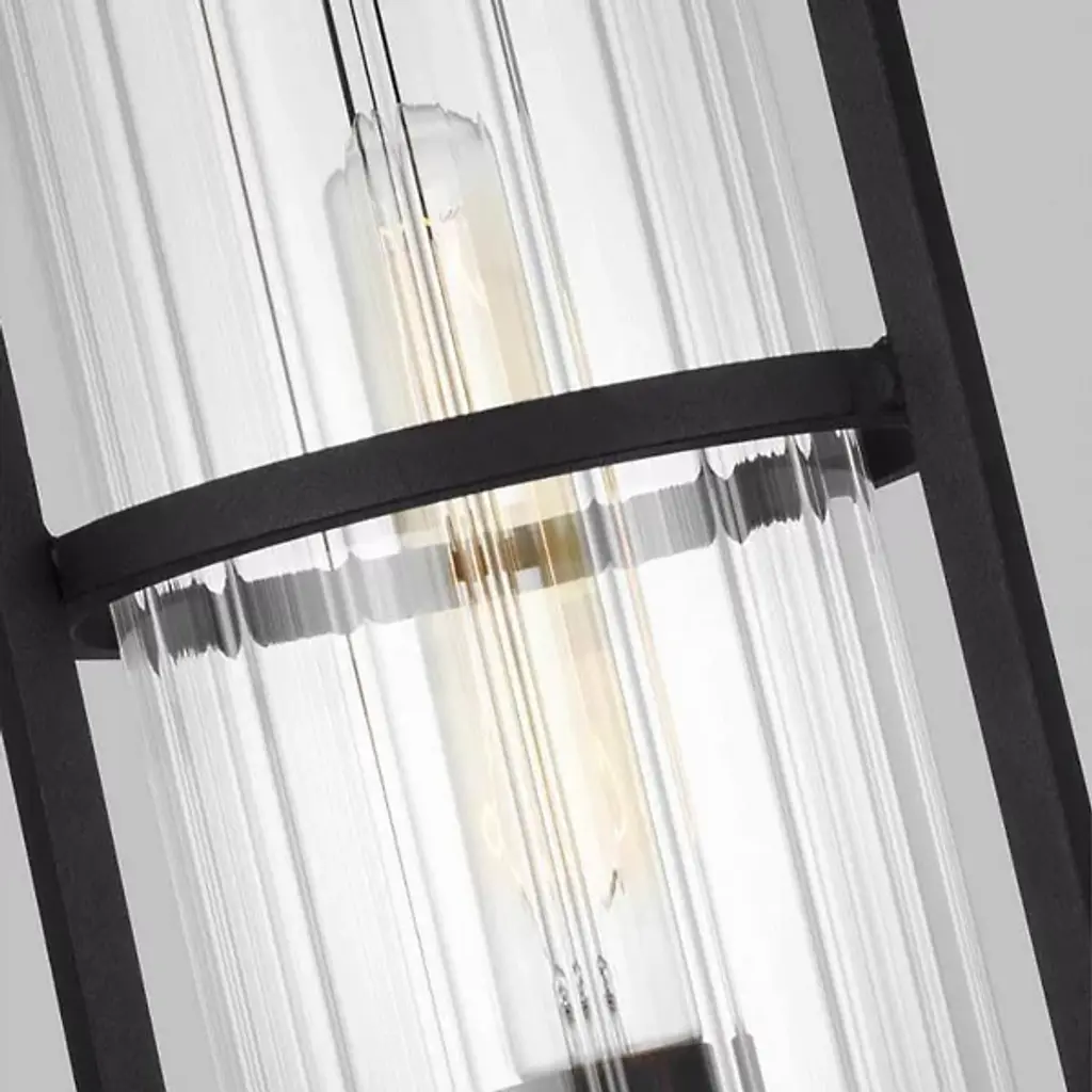 Clear fluted glass shades give the Alcona Outdoor Post Lantern from Visual Comfort Studio, formerly known as Sea Gull Lighting, a refined industrial look. The elegant square backplate and metal center ring provide a floating glass effect. This one-light outdoor pendant fixture creates a warm and inviting welcome presentation for your home's exterior. Its aluminum construction gives the product durability for damp locations.