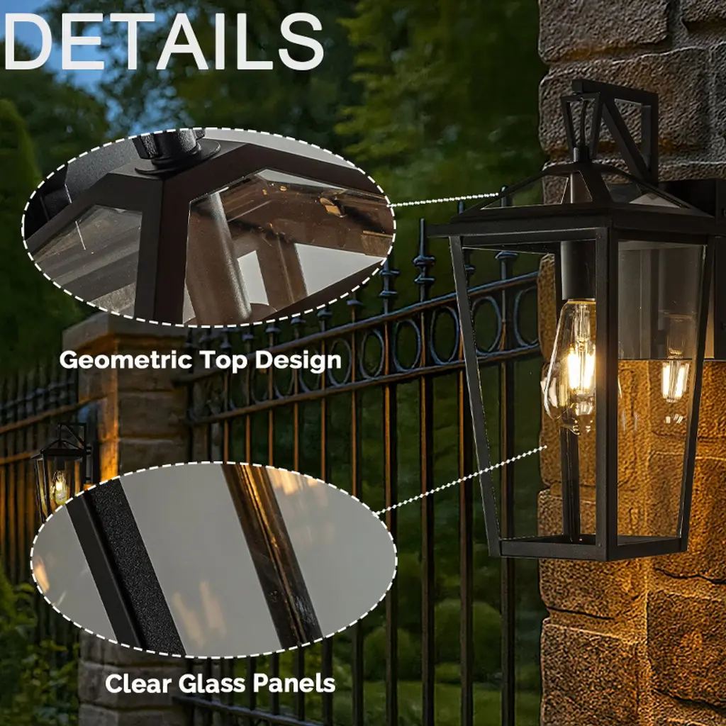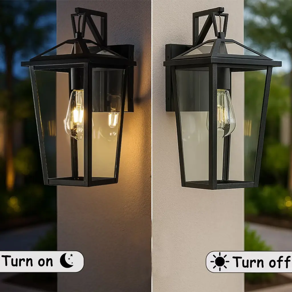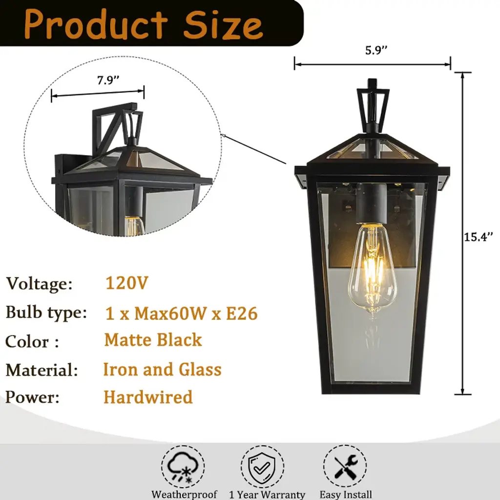 Bring timeless charm and practical design to your outdoor space with this matte black wall lantern. Crafted from sturdy iron with a durable powder-coated finish, this fixture withstands the elements while offering a refined, high-end look. The trapezoidal frame showcases four clear tempered glass panels that maximize brightness, allowing the light to shine freely through. A standout feature is the thoughtfully designed open bottom, which makes changing the bulb incredibly easy — no tools, no hassle. Plus, the stylish geometric detail on the top adds a touch of modern sophistication while providing structural reinforcement. Perfect for front porches, garage doors, back patios, or side entrances, this versatile fixture supports any standard E26 base bulb (up to 60W, not included), letting you choose the brightness and tone that suits your home best. Whether you're creating curb appeal or adding security lighting, this lantern blends style and function beautifully.