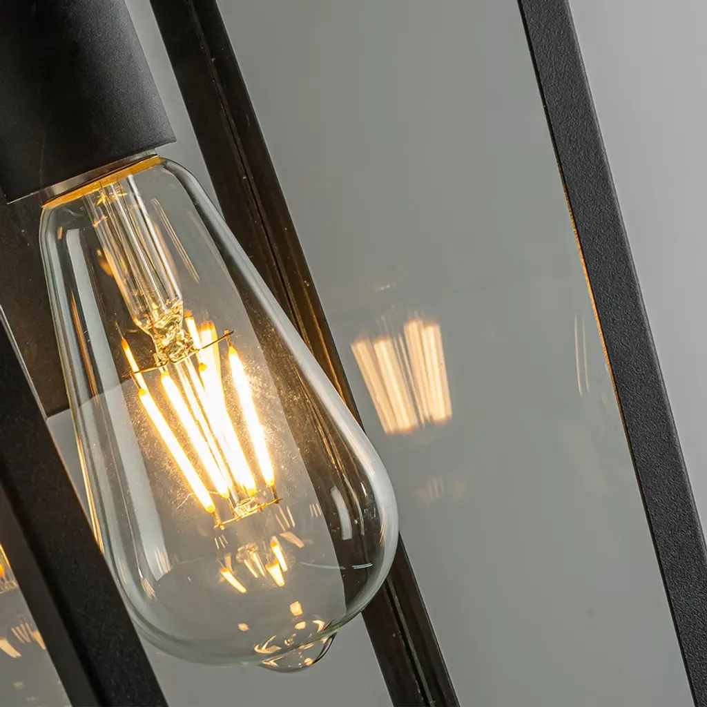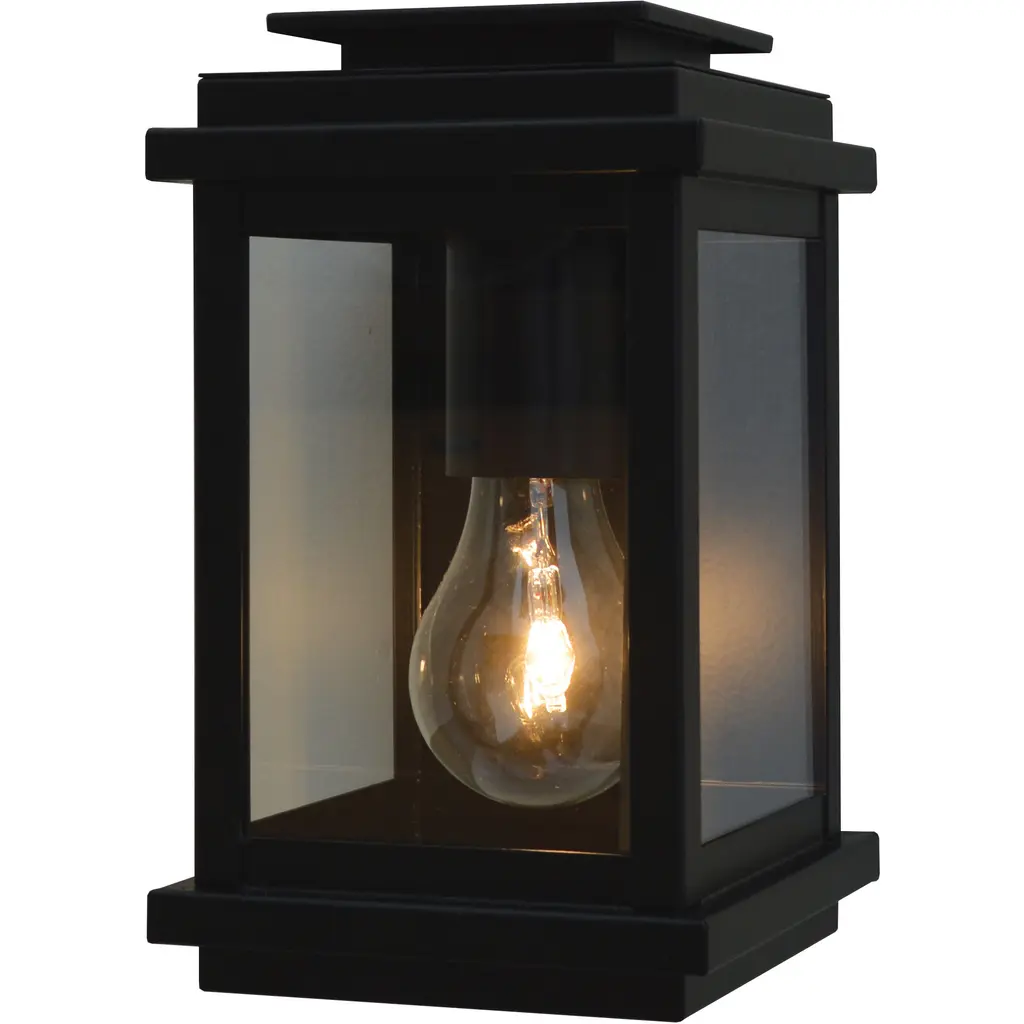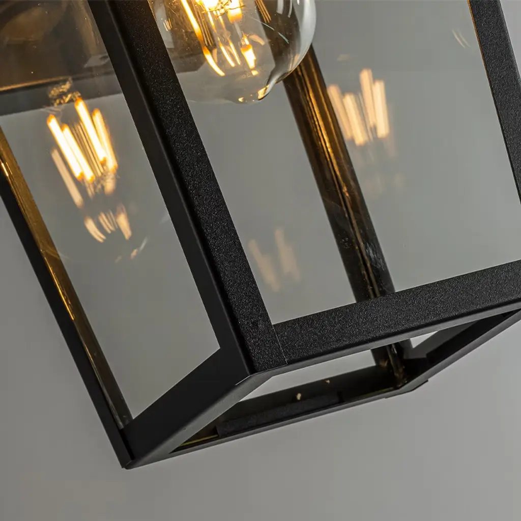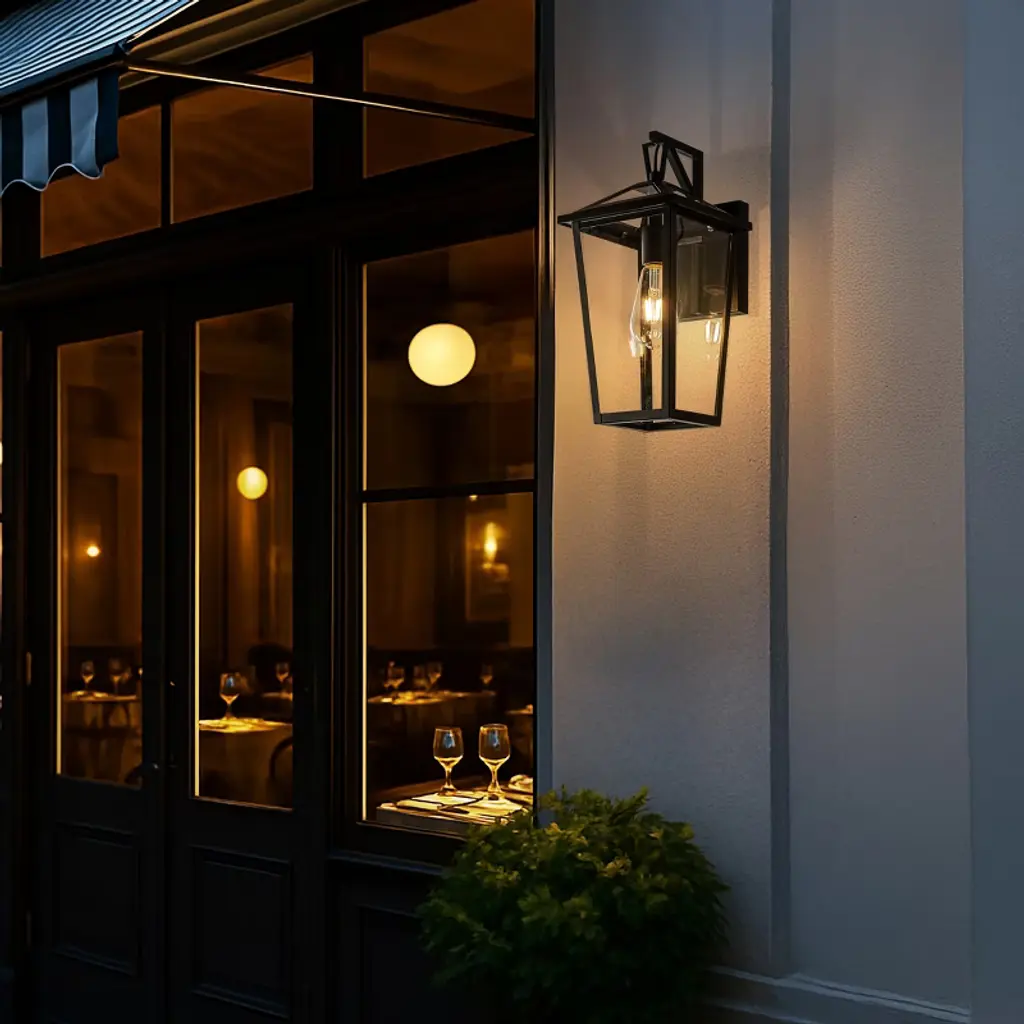 Bring timeless charm and practical design to your outdoor space with this matte black wall lantern. Crafted from sturdy iron with a durable powder-coated finish, this fixture withstands the elements while offering a refined, high-end look. The trapezoidal frame showcases four clear tempered glass panels that maximize brightness, allowing the light to shine freely through. A standout feature is the thoughtfully designed open bottom, which makes changing the bulb incredibly easy — no tools, no hassle. Plus, the stylish geometric detail on the top adds a touch of modern sophistication while providing structural reinforcement. Perfect for front porches, garage doors, back patios, or side entrances, this versatile fixture supports any standard E26 base bulb (up to 60W, not included), letting you choose the brightness and tone that suits your home best. Whether you're creating curb appeal or adding security lighting, this lantern blends style and function beautifully.