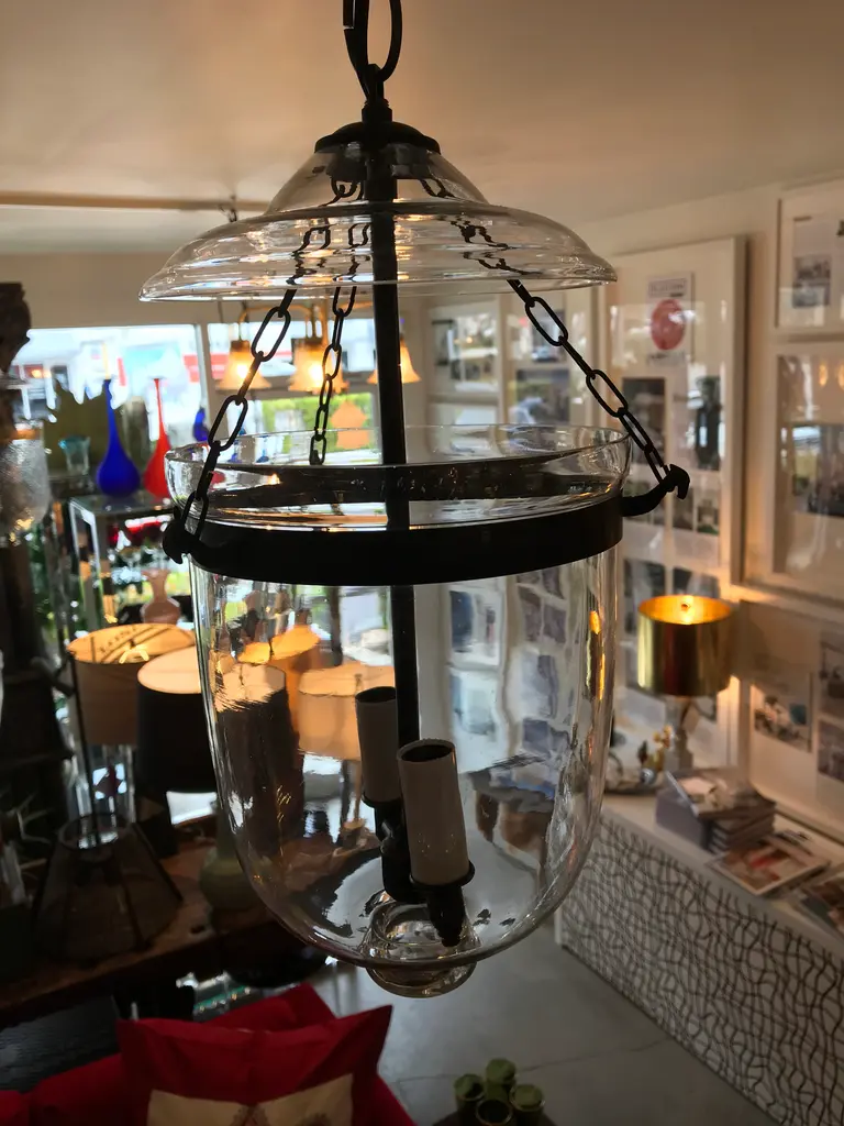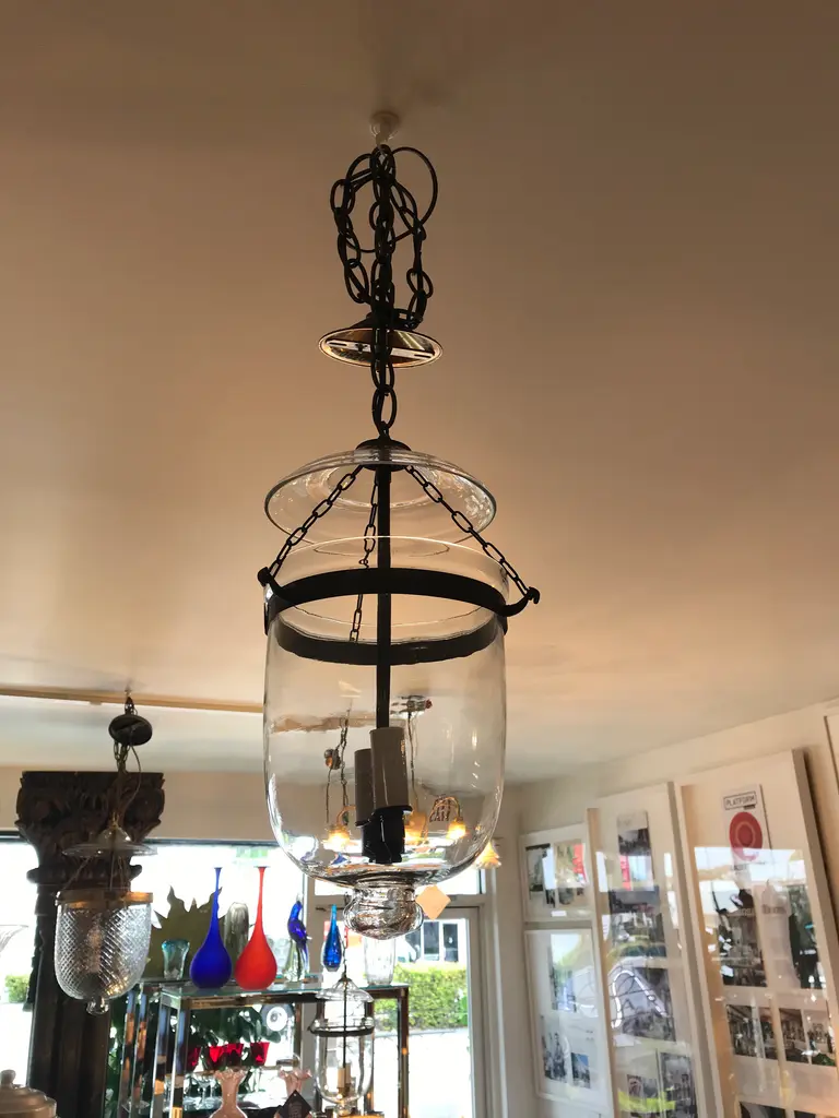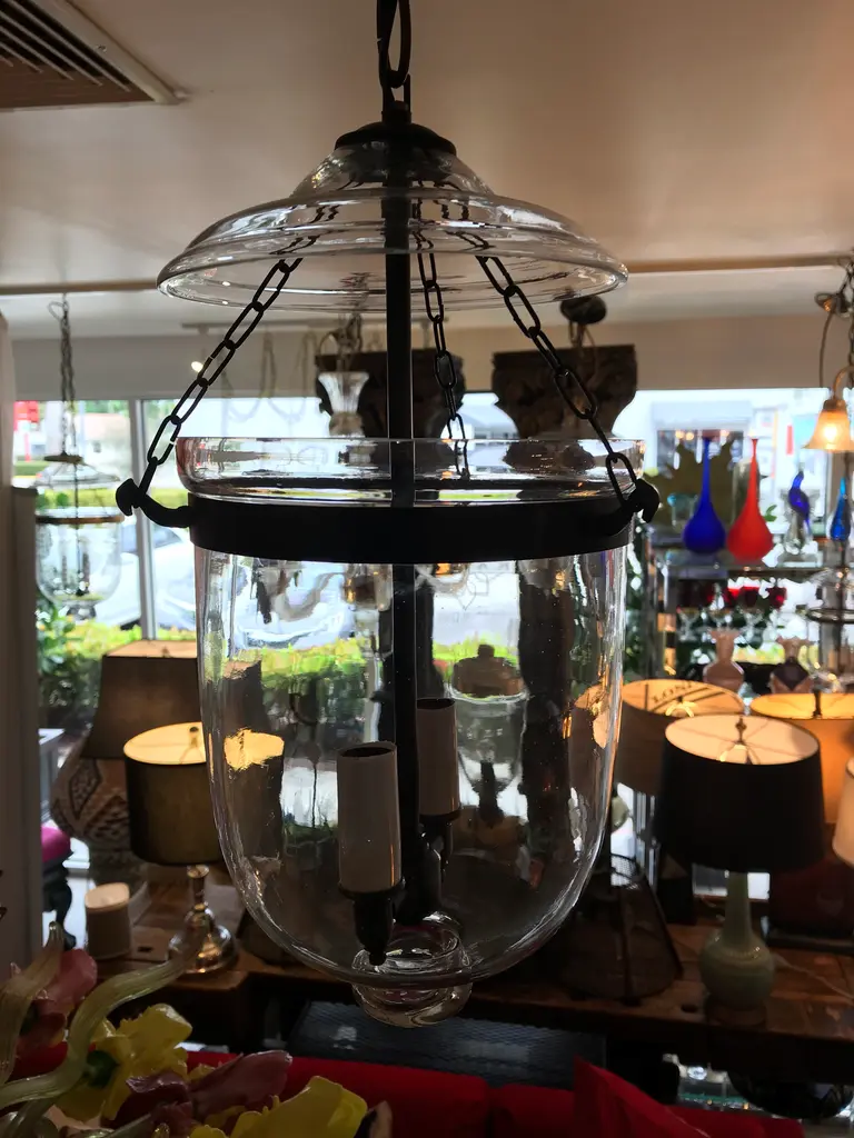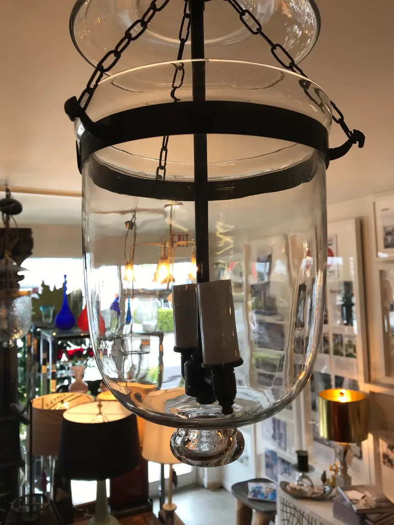 This is an antique glass lantern that has been restored and newly wired. It has all the original metal banding and small chains that connect the body to the lid. The sockets and extended chain and canopy are oil-rubbed bronze. The dimensions shown are from the bottom of the lantern to the hoop on the glass lid. It measures 49 inches to the ceiling when the extended chain and canopy are included.