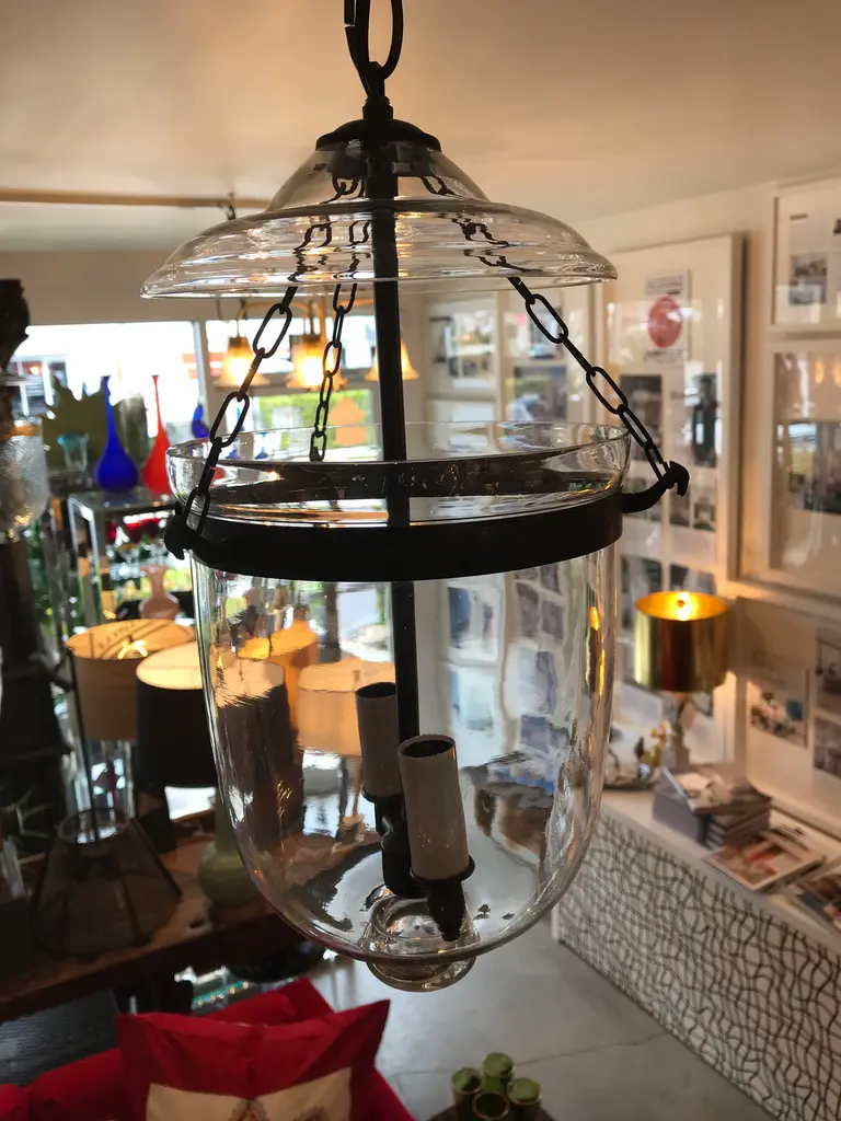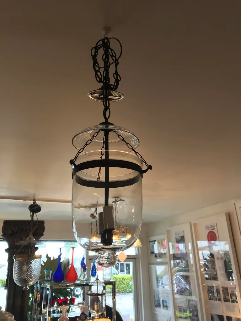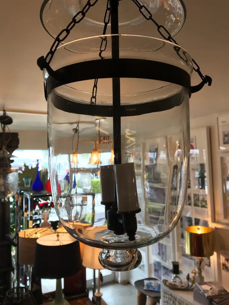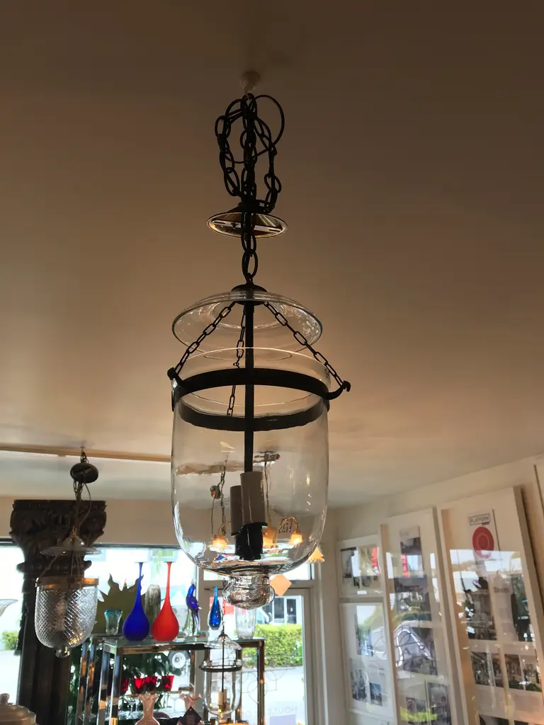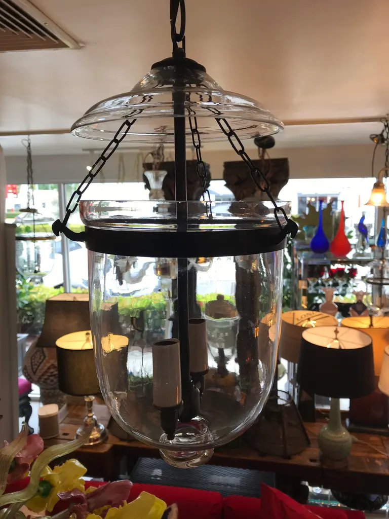 This is an antique glass lantern that has been restored and newly wired. It has all the original metal banding and small chains that connect the body to the lid. The sockets and extended chain and canopy are oil-rubbed bronze. The dimensions shown are from the bottom of the lantern to the hoop on the glass lid. It measures 49 inches to the ceiling when the extended chain and canopy are included.