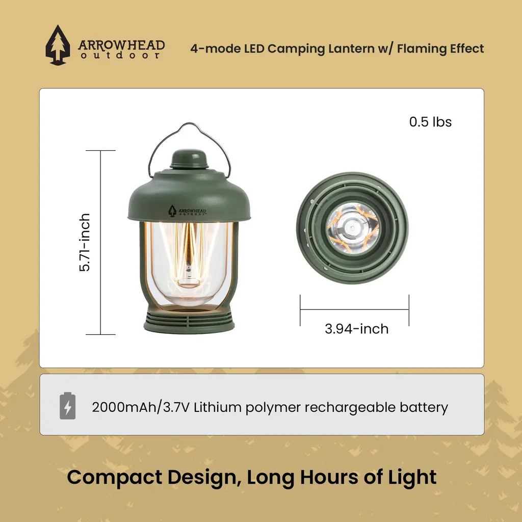 Illuminate Your Outdoor Adventures with the ARROWHEAD OUTDOOR 6-inch LED Camping Lantern. The ARROWHEAD OUTDOOR 6-inch LED Camping Lantern is a powerful and versatile lighting solution for camping, hiking, or any outdoor activity. This lantern boasts a maximum output of 280 lumens, providing ample brightness to light up your campsite or trail. Here's what makes this lantern stand out: Multiple Lighting Modes: Choose from 4 different lighting modes to suit your needs, whether you require a powerful spotlight, a gentle nightlight, or an SOS signal. Long-lasting Battery: The built-in rechargeable battery delivers extended illumination, ensuring you have light throughout your adventure. Durable Construction: Built to withstand the elements, this lantern features an IP6X rating, making it dustproof and water-resistant. Convenient Charging: The USB-C charging port allows for easy and efficient recharging using a power bank or wall adapter. Portable Design: The compact size and included carabiner make it easy to carry and hang the lantern from branches, backpacks, or tents.