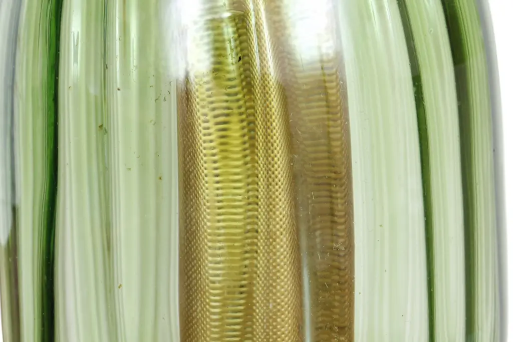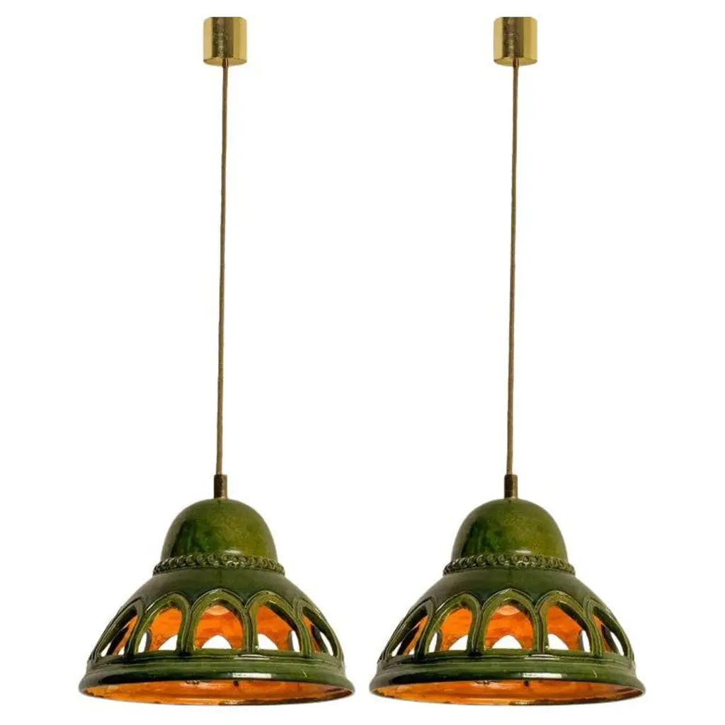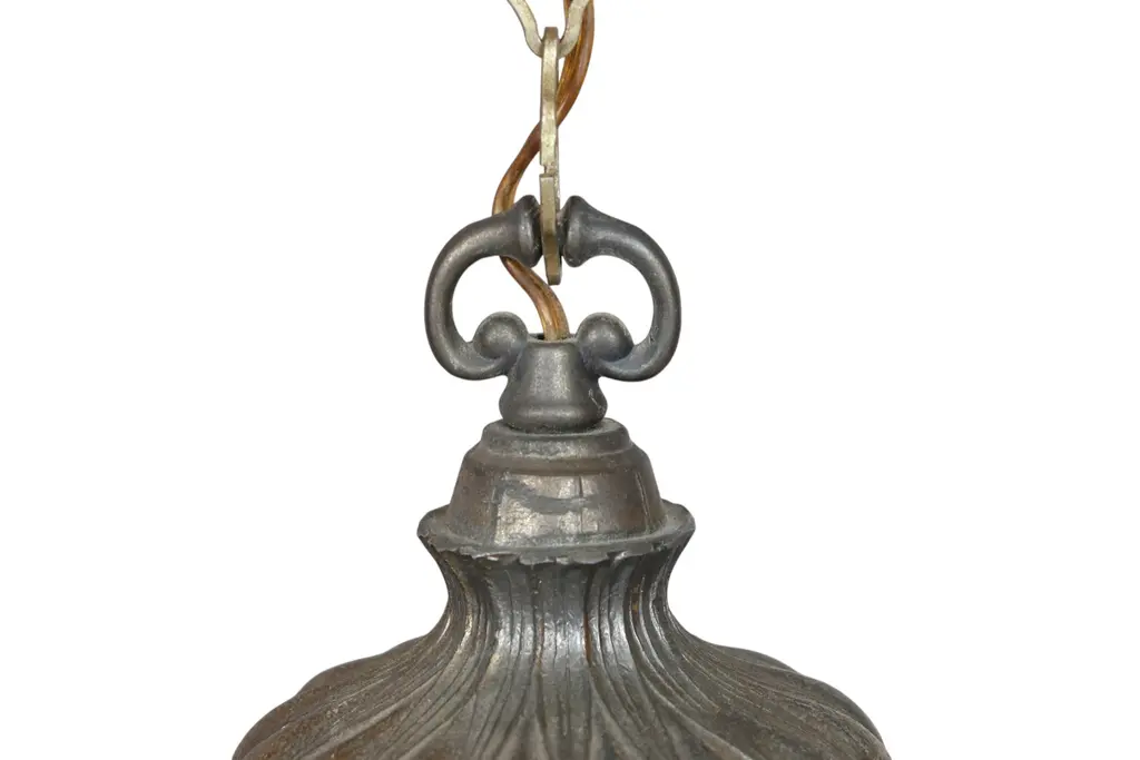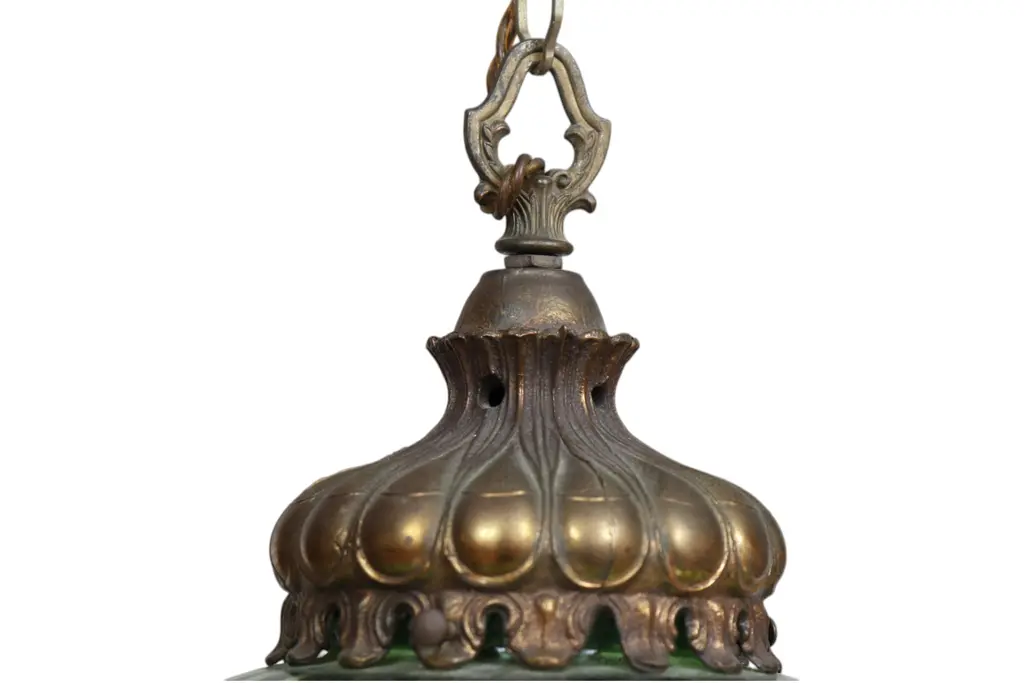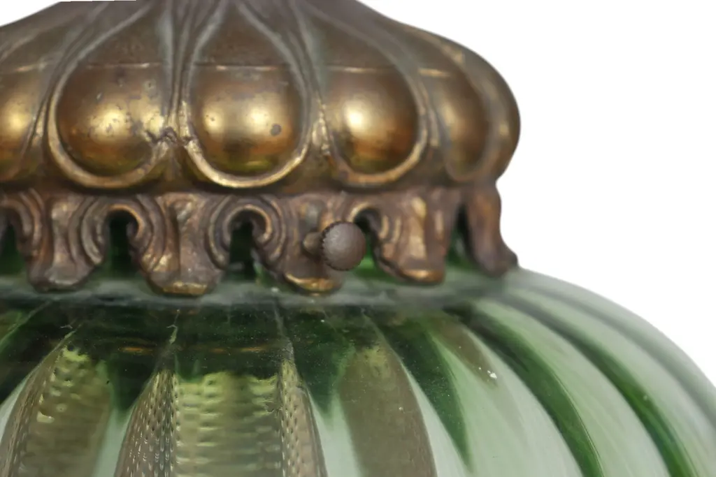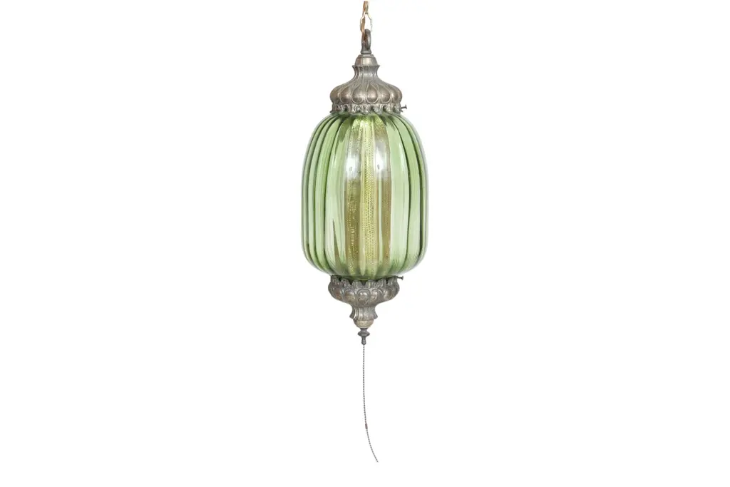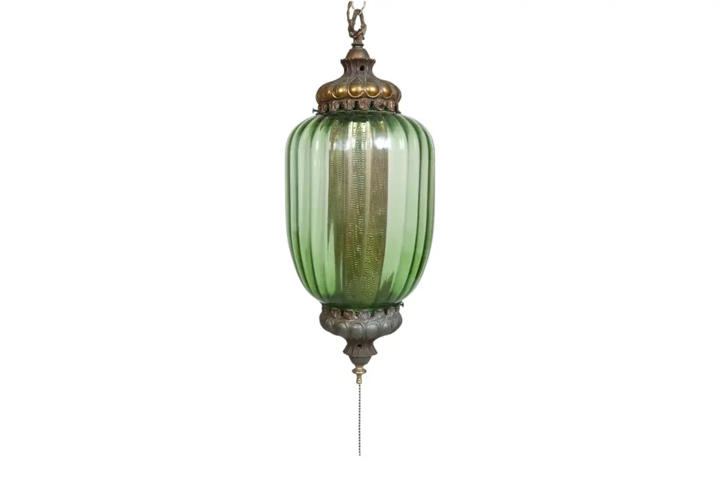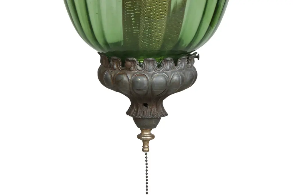 A pair of Art Moderne glass lanterns, circa 1940s. Kelly green ribbed glass lanterns are secured with cast metal caps and switch on with pull chains from below. Lanterns hang with accompanying chains. Dimensions do not include chain or pull chain.