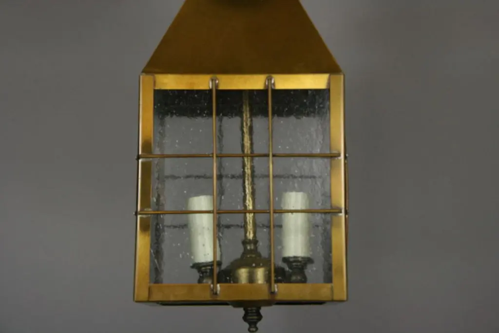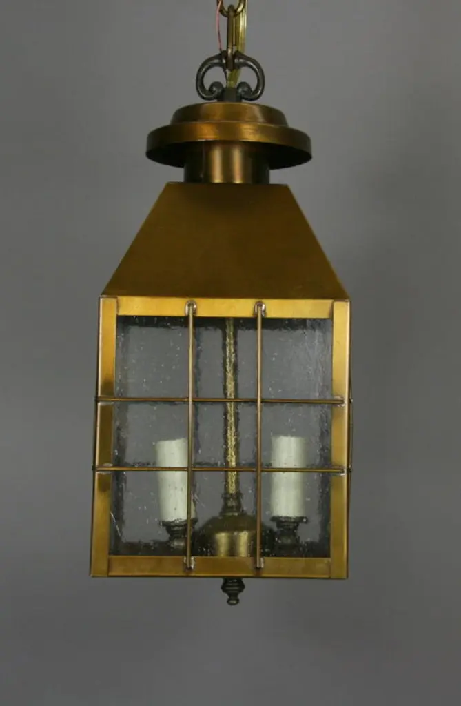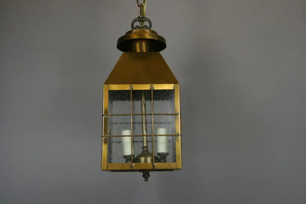 A brass lantern with four pebbled glass panels. Two light. (Two available).Priced individually.