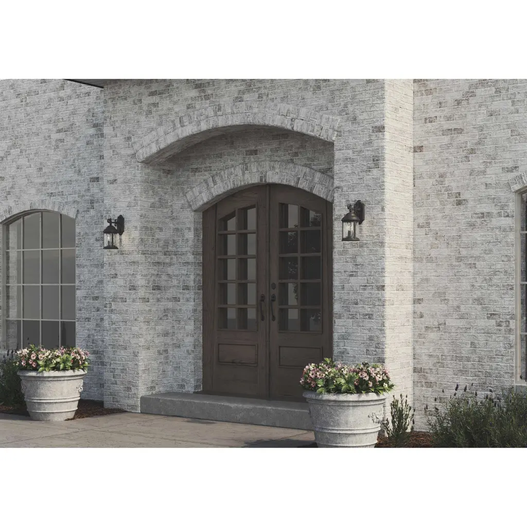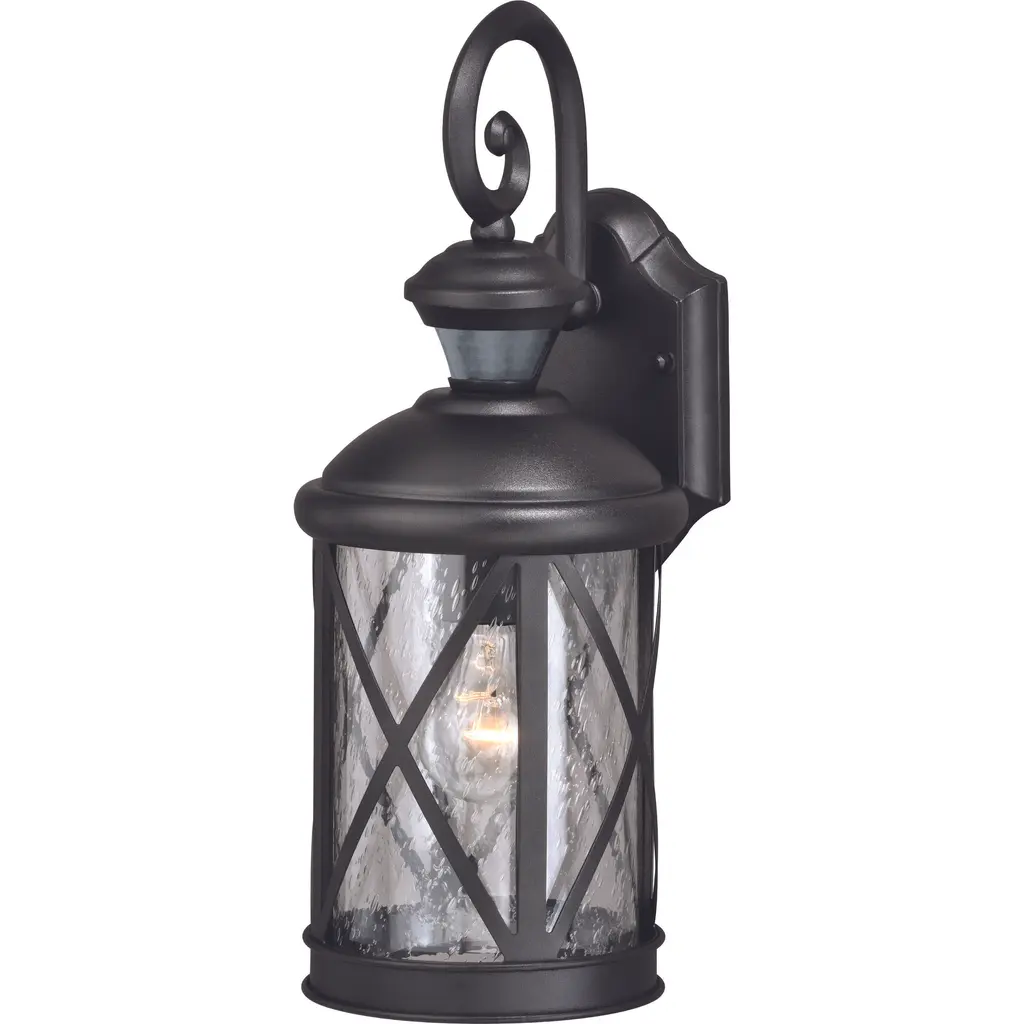 Inspired by lanterns from the Old World, the Ashmore collection incorporates handsome details, quill-scrolled arms and decorative finials. The water seeded glass is in a die-cast aluminum frame. Two-light wall lantern. Textured Black finish.