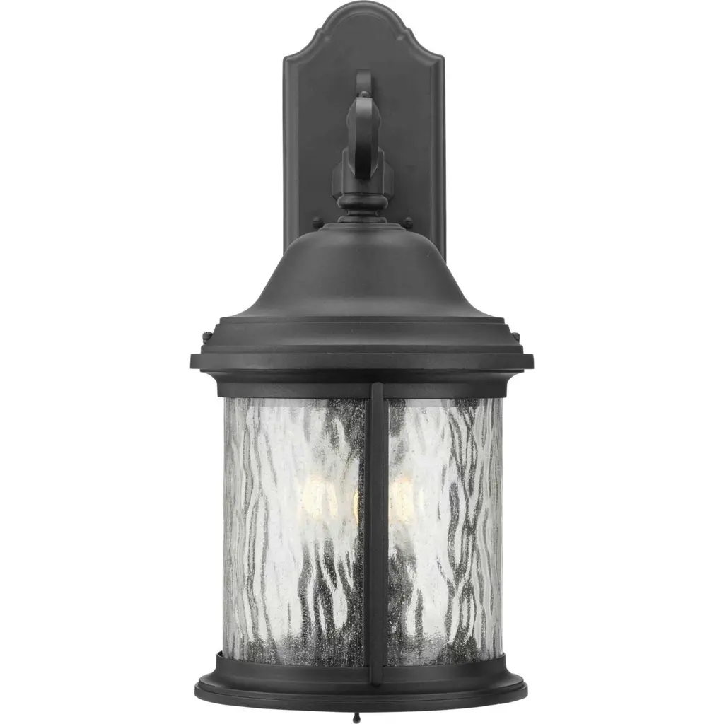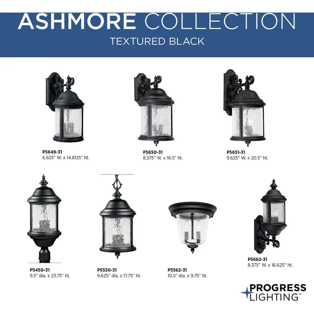Inspired by lanterns from the Old World, the Ashmore collection incorporates handsome details, quill-scrolled arms and decorative finials. The water seeded glass is in a die-cast aluminum frame. Three-light 9-5/8" wall lantern in a Black finish.
