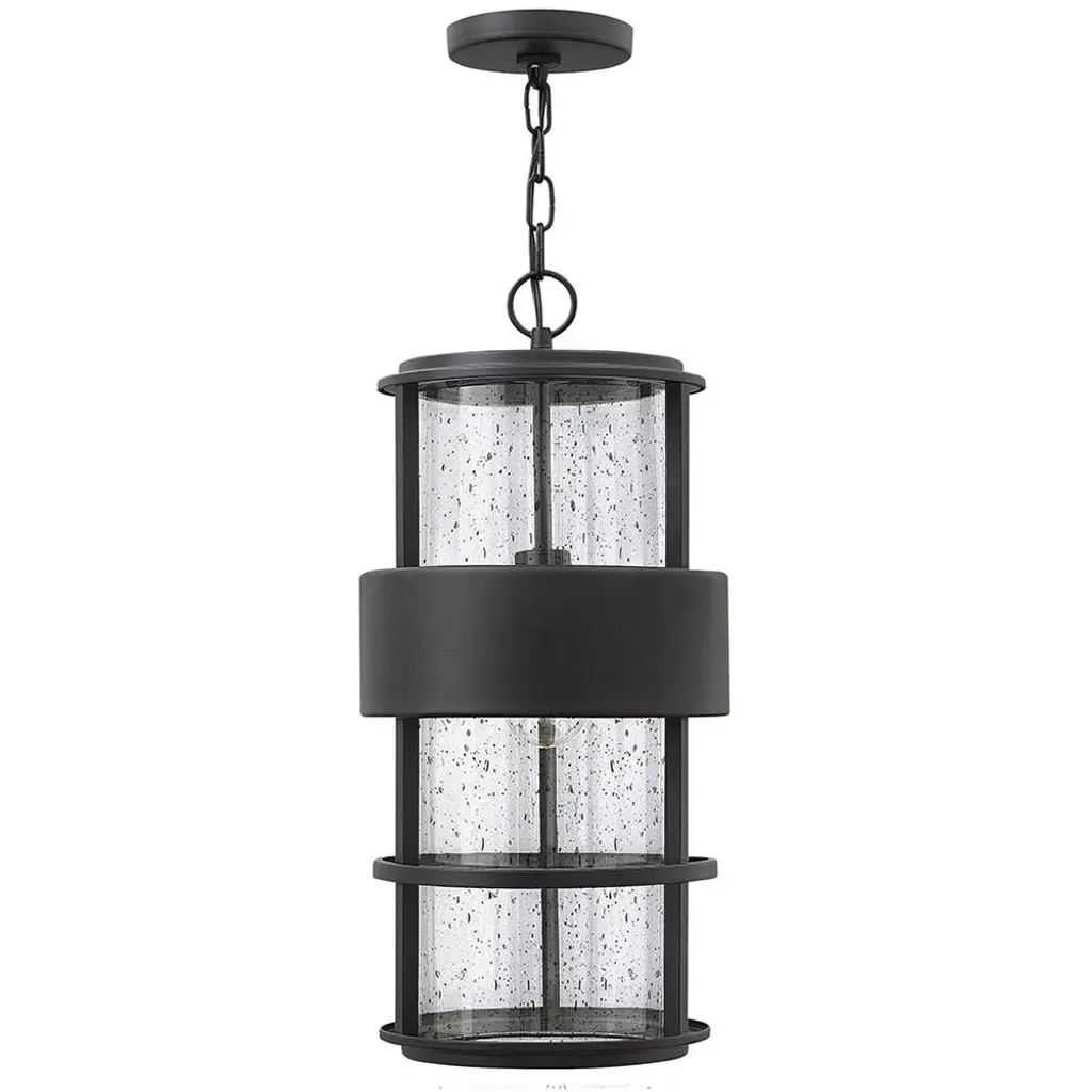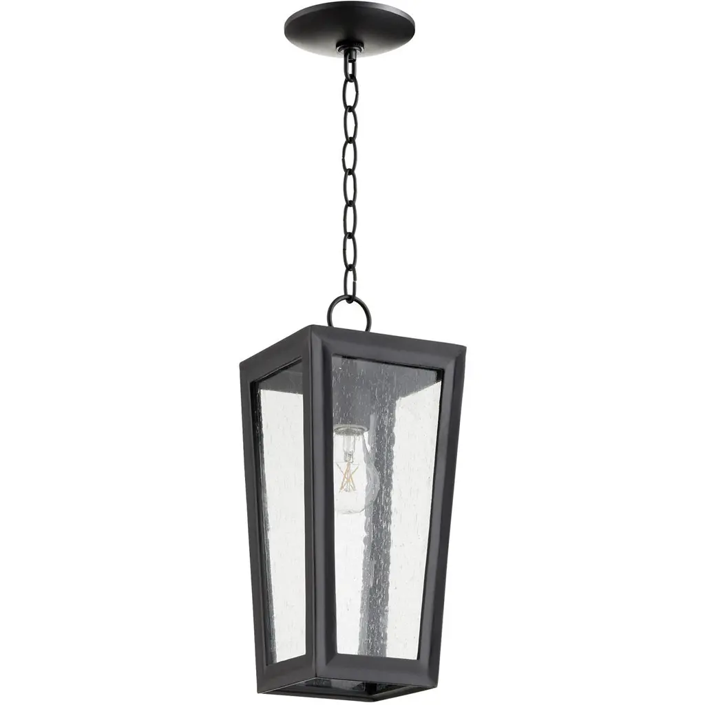 The Avalon Collection is the perfect addition to any outdoor horizon or canopy. The 13.75" hanging lantern brings ambient lighting to an overhang area without occupying any usable space. The quality craftsmanship is inspired by Transitional design themes and can complement a variety of exterior styles. It has a round, clear Crackled Glass shade that is housed in a durable cast aluminum frame. The matching roof features a simple awning detail around the rim.