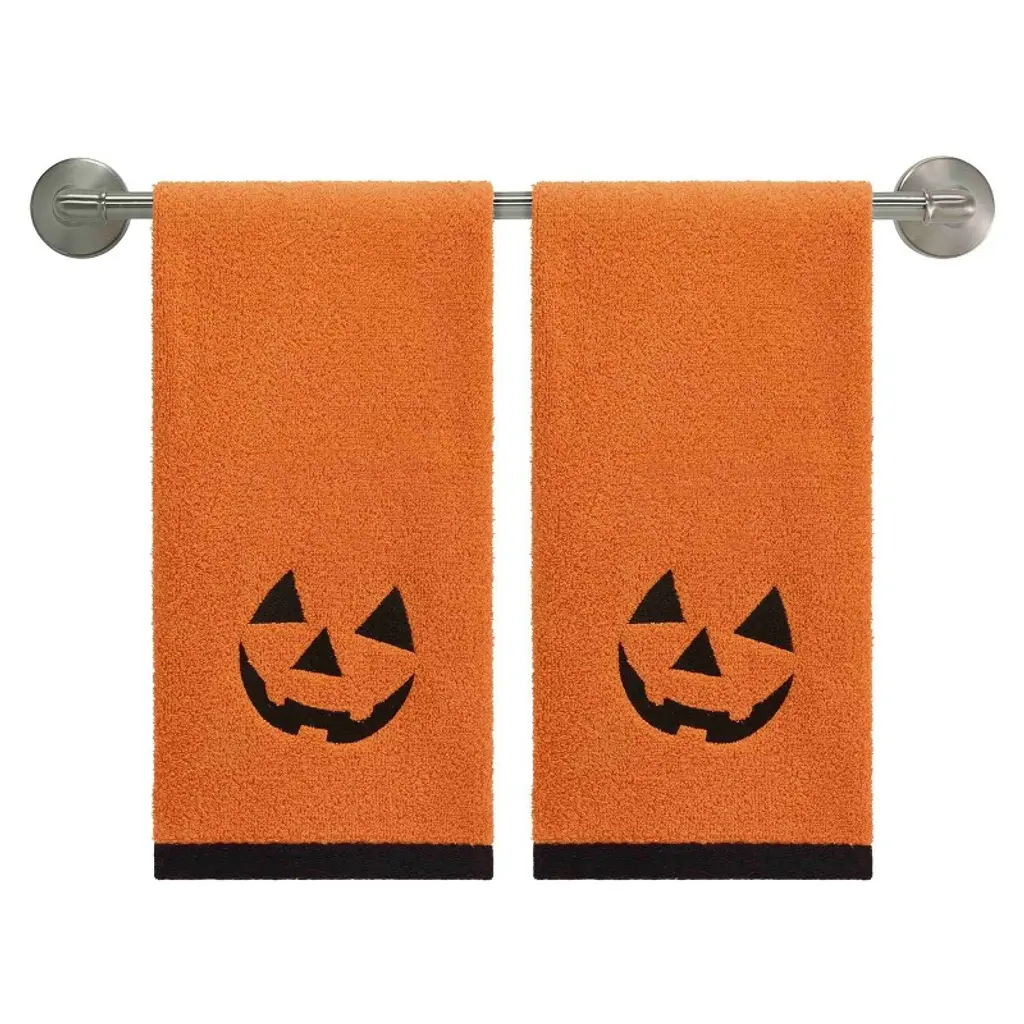 The Avanti Jack-O-Lantern Halloween 2-Pack Embroidered Decorative Hand Towel Set features the eyes, nose and mouth of a happy jack-o-lantern in black. The orange 100% cotton terry ground is finished with a black polyester border. Set includes two 16" x 26" towels, machine washable.