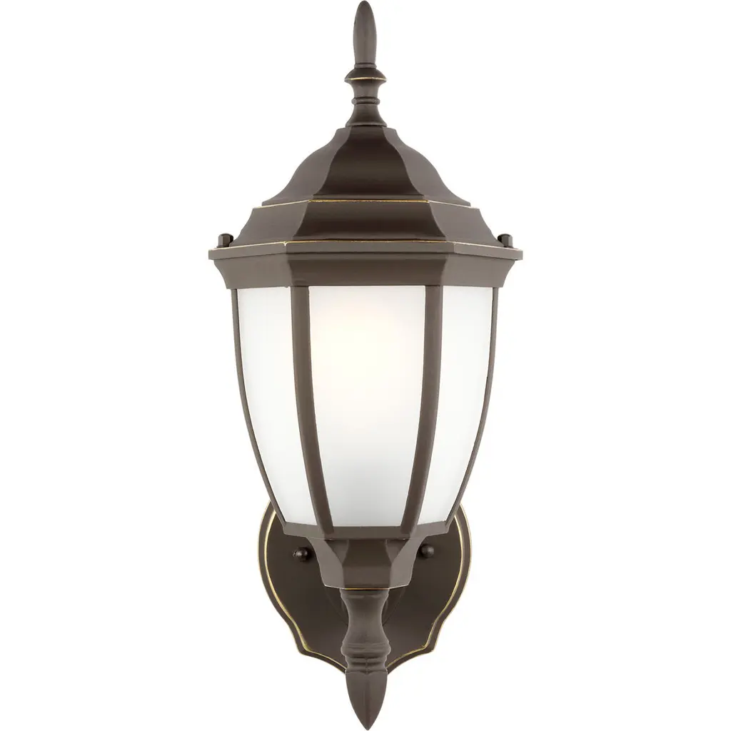 The Bakersville one light outdoor wall fixture in antique bronze creates a warm and inviting welcome presentation for your home's exterior. Bakersville outdoor lighting fixtures from are made to complement a wide range of architectural styles. Each light is crafted from high quality, durable steel and aluminum to provide you sensible style that lasts. The large, 1-light outdoor wall lantern is offered in Heirloom Bronze with Satin Etched glass or Clear Beveled glass. The remaining assortment of wall lanterns in three sizes and a Flush mount ceiling fixture are offered in a Black Powder coat finish with Satin Etched glass (with ENERGY-STAR-qualified LED lamping options) or Clear Beveled glass (which can easily convert to LED by purchasing LED replacement lamps sold separately).