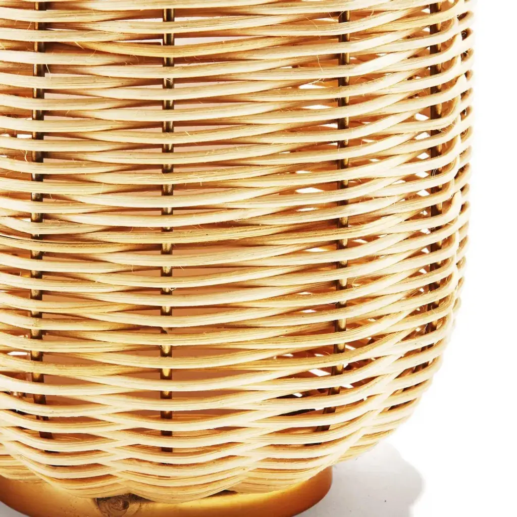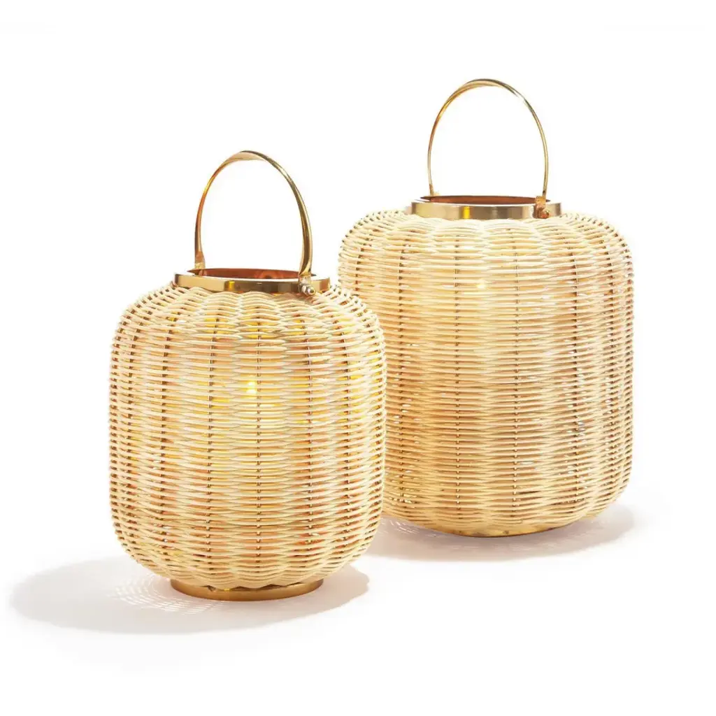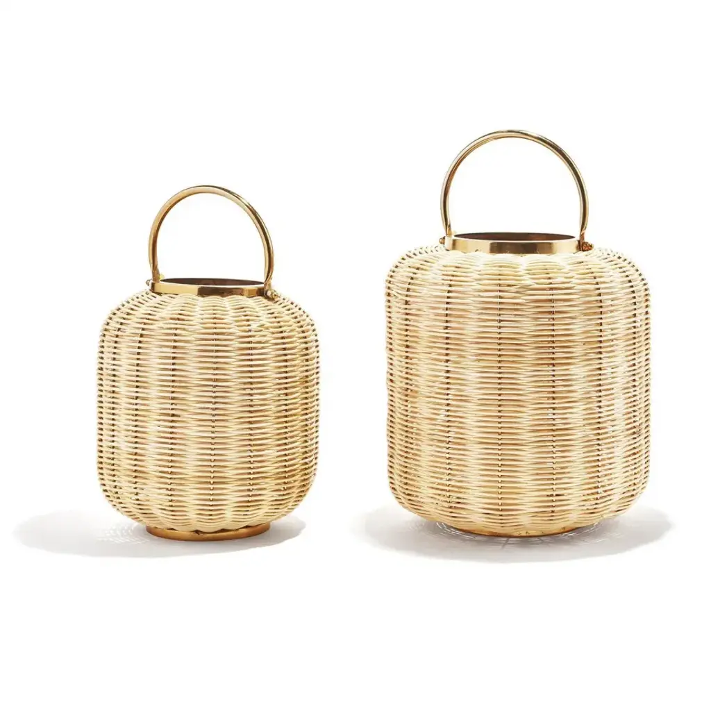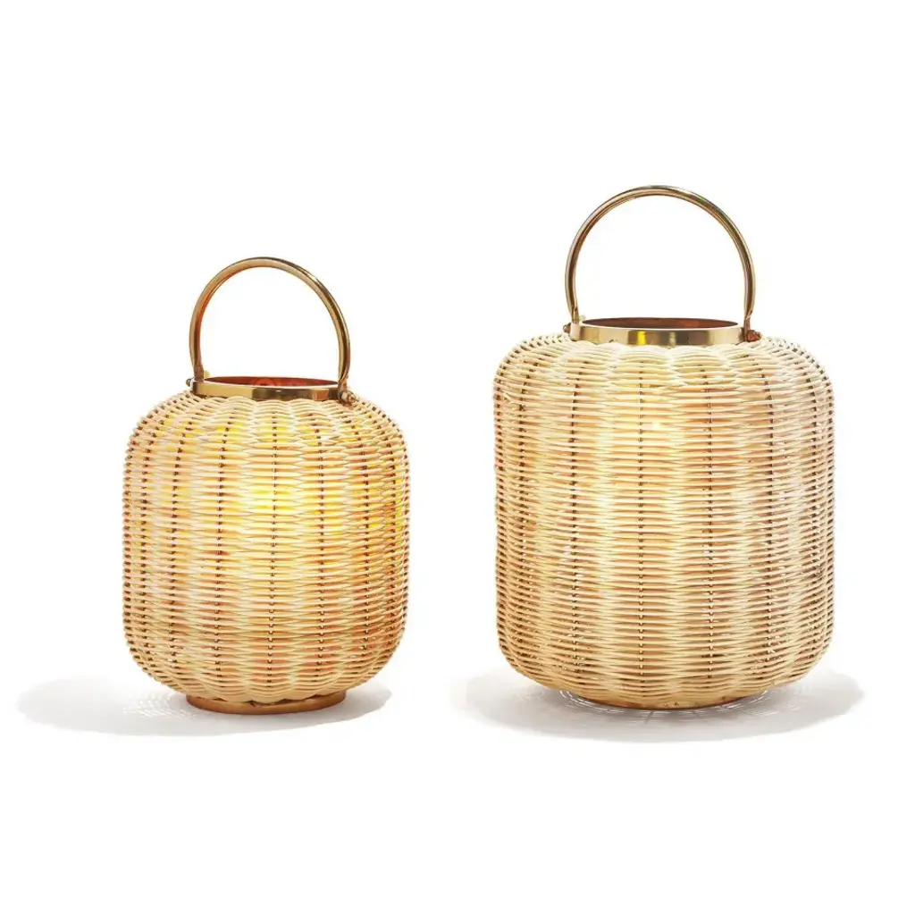 These lanterns are crafted from woven wicker and accented with gold handles and hardware. This natural piece will bring a beautiful glow to your indoor or outdoor space!