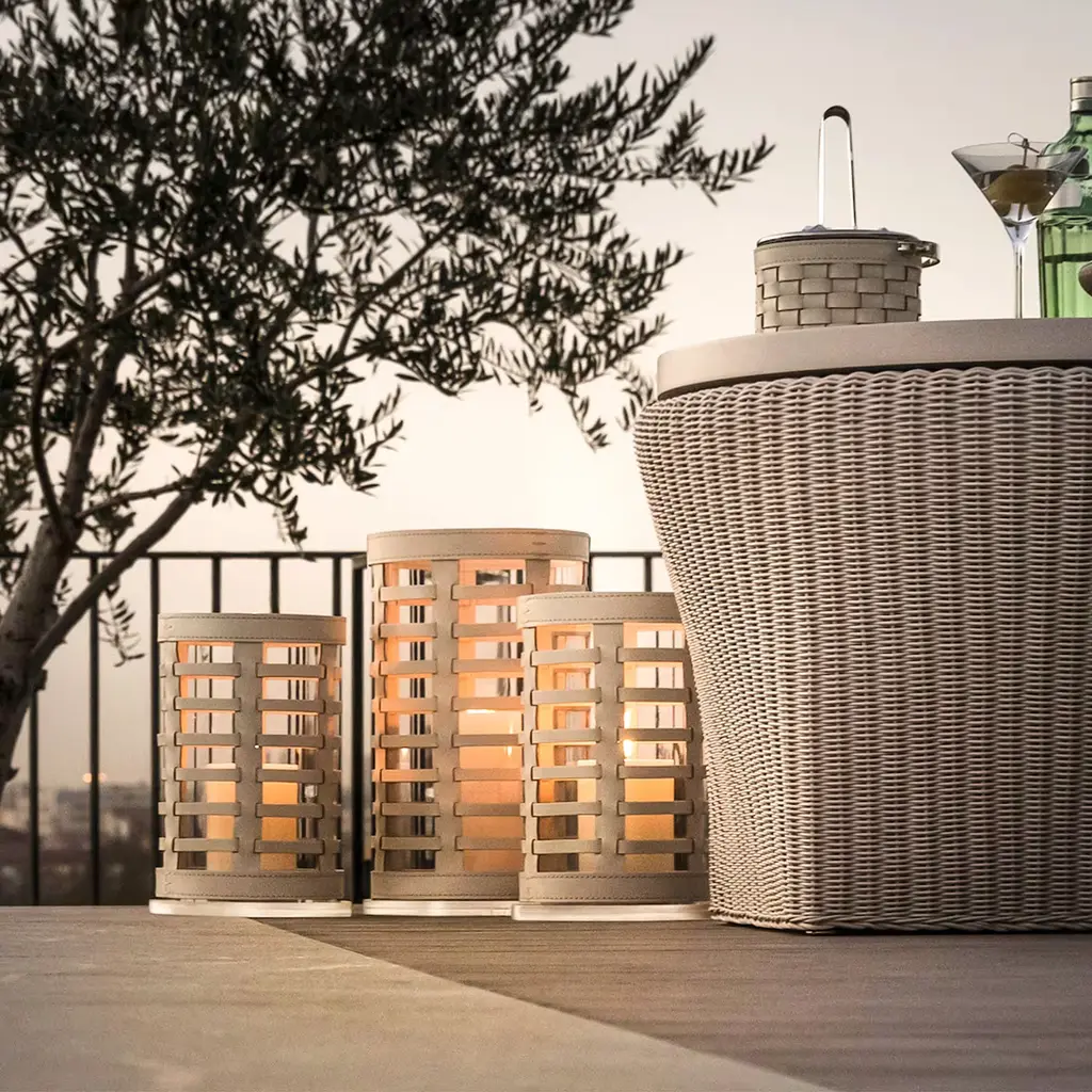 Hurricane lantern, acrylic crystal covered with woven leather. The precious handmade braiding provides it with an elegant appeal that is conveyed to any location in which it is placed. The peculiarity of this elegant object is the perforated pattern that allows the light to pass and gives the accessory a refined touch. Fit for both indoor and outdoor use. Available in black, grey, ivory, chocolate brown, turquoise, white and royal blue.