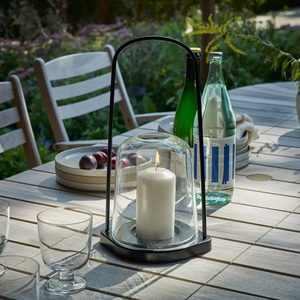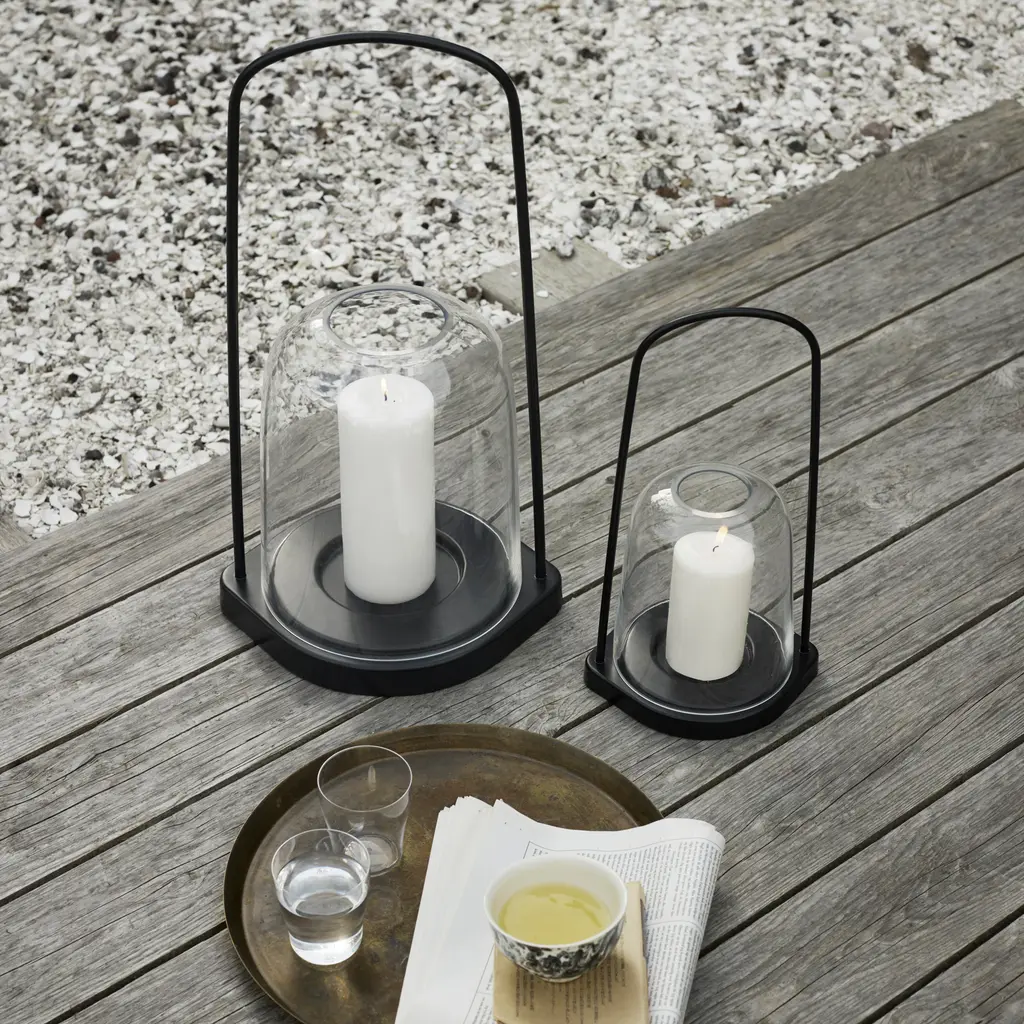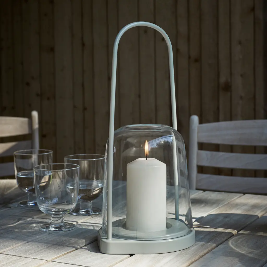 The perfect lighting solution for outdoor dinners with friends and summer garden parties. Part of the Skagerak collection, the Bell Lantern Ø30 has a minimalist design and a durable build. Designer Martin Solem paired a bell-shaped glass lid with an elongated handle, creating a simple and elegant lantern for indoor and outdoor use. The lid slides on and off the base easily and allows the user to place a smaller or a larger candle inside. Protected by the glass walls, the candle remains lit and bright even in windy weather conditions. The handle is comfortable to use and remains locked in an upright position. Crafted from outdoor-friendly materials: glass, stainless steel, and powder-coated aluminum.