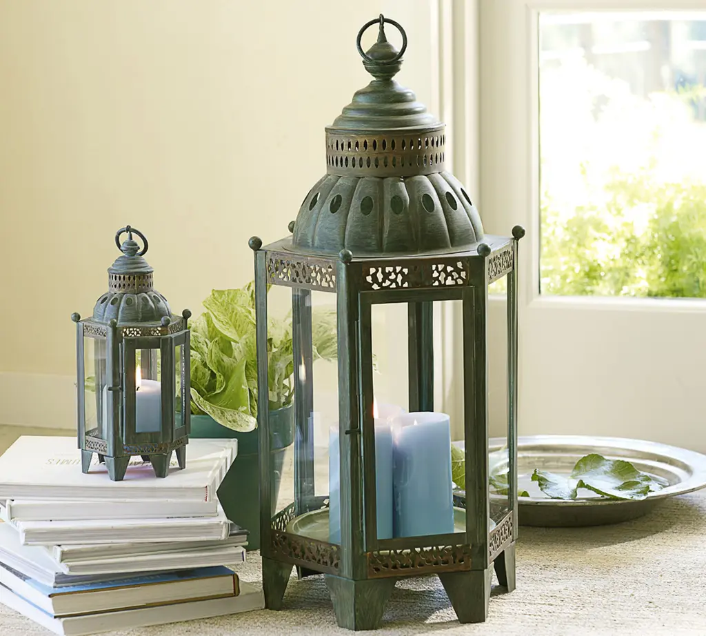 These hexagonal lanterns are finished in beautiful contrasting shades of verdigris and aged brass. Crafted from pierced metal and glass, they have hinged doors and a loop for hanging.