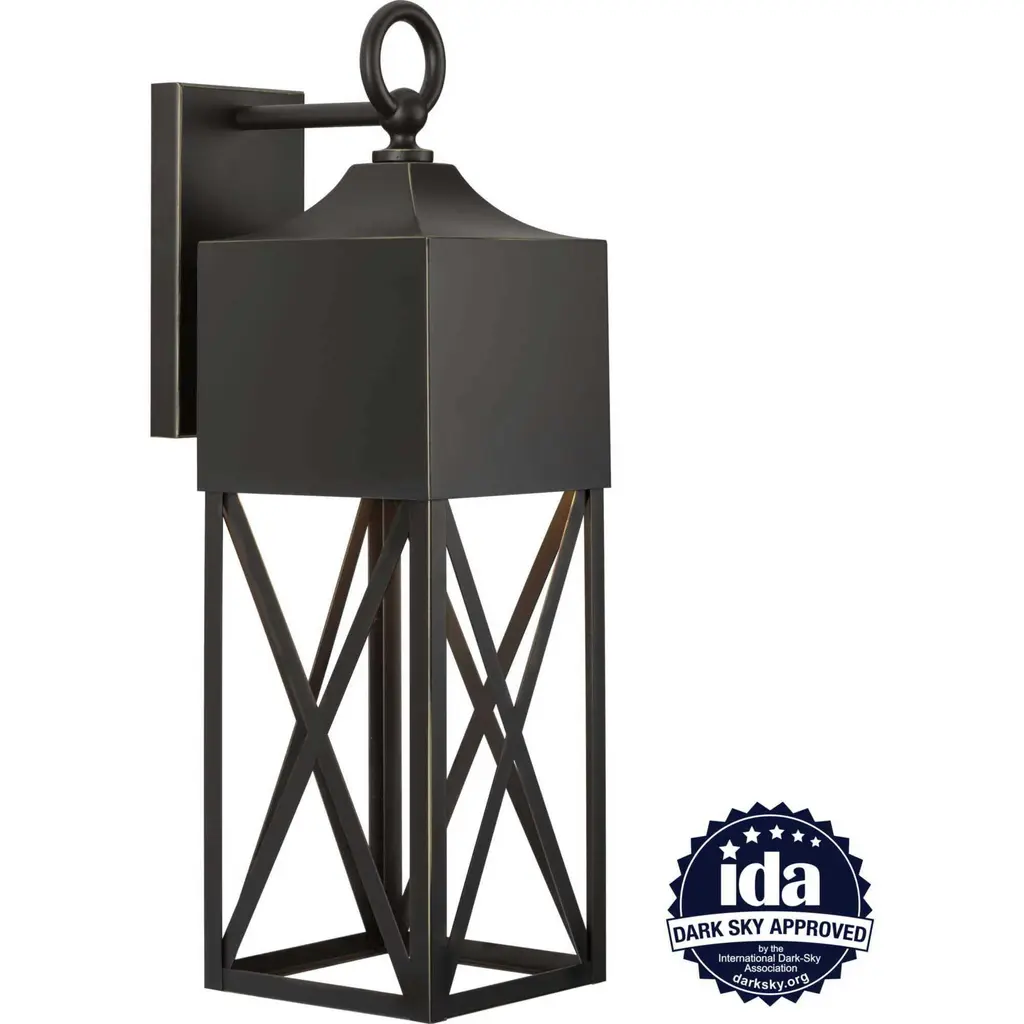 Birkdale lanterns feature large scale open geometric cages paired with a stately roof. Perfect for a modern farmhouse, rustic or traditional styles offering beautiful curb appeal. Beautiful antique bronze finish on a die-cast frame. The lantern's full cutoff design adheres to Dark Sky principles by minimizing glare and light trespass to protect the night sky while still providing generous illumination. Ideal for outdoor applications to include porches, patios, decks and entryways.