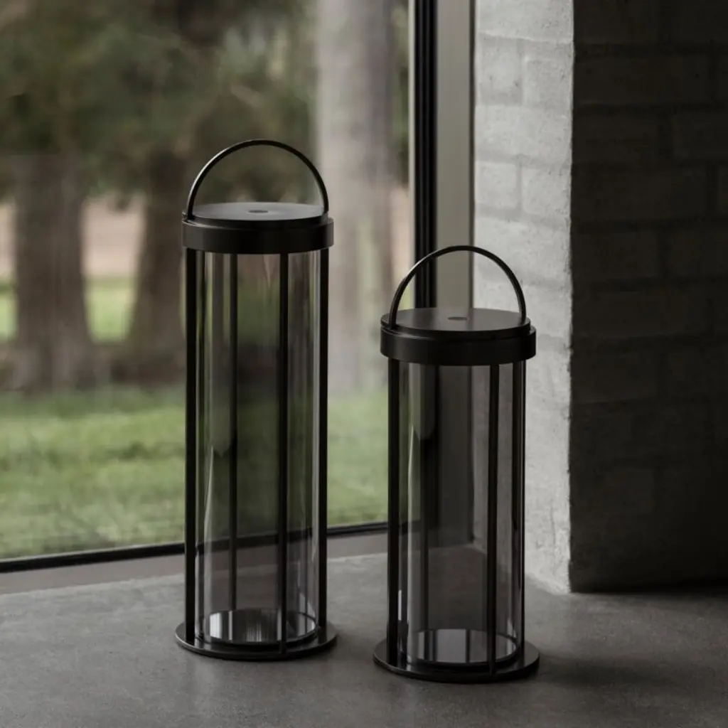 Designed to resemble an architectural tower, this sleek lantern from Blomus provides soft illumination indoors and out. The slim, cylindrical lantern secures a darkened glass shade within a gunmetal-finished aluminum frame, casting ambient light from the top and bottom. The rechargeable lantern offers three light settings and a dimmable mode, providing up to 22 hours of illumination.