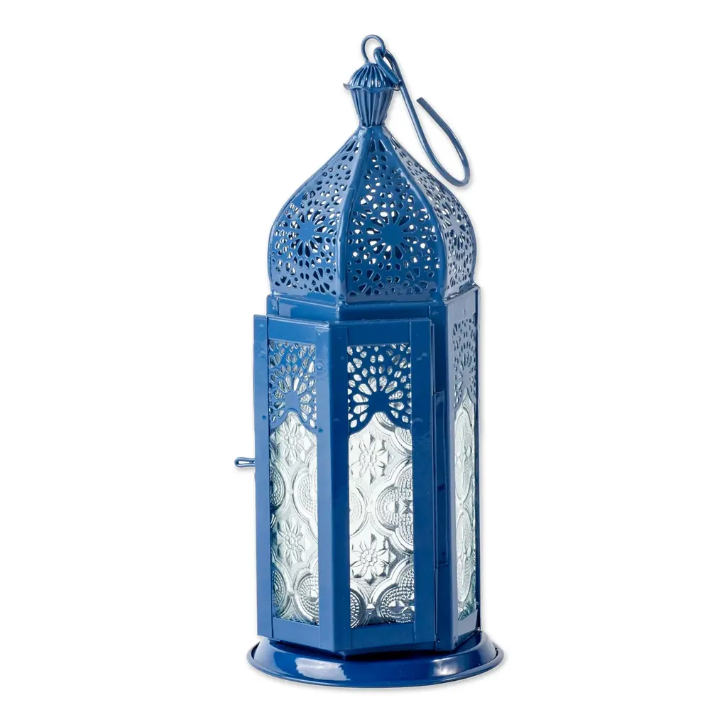 Blue Hanging Lantern With Decorative Glass From India- Bazaar Blue