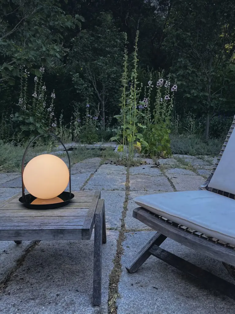The perfect light companion for social gatherings indoors or out, the Bola Lantern (2021) is rechargeable and dimmable. One charge lasts 10-400 hours depending on brightness level, and the four-stage dimmer is easy to operate. Bulb (included): integrated LED, 3.2W, 280 lumens, 1800-2700K warm color temperature. Bring inside when not using; protect from inclement weather. Made in China.
