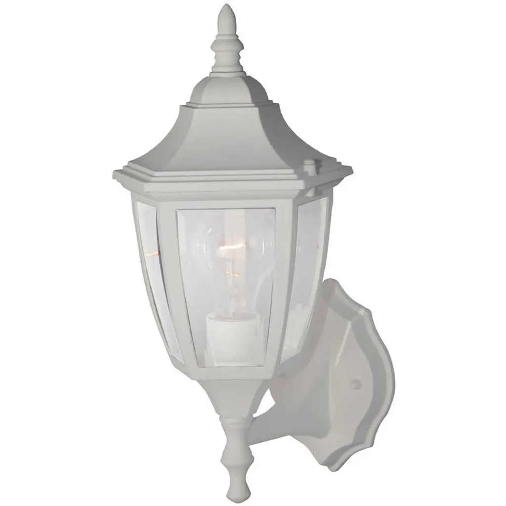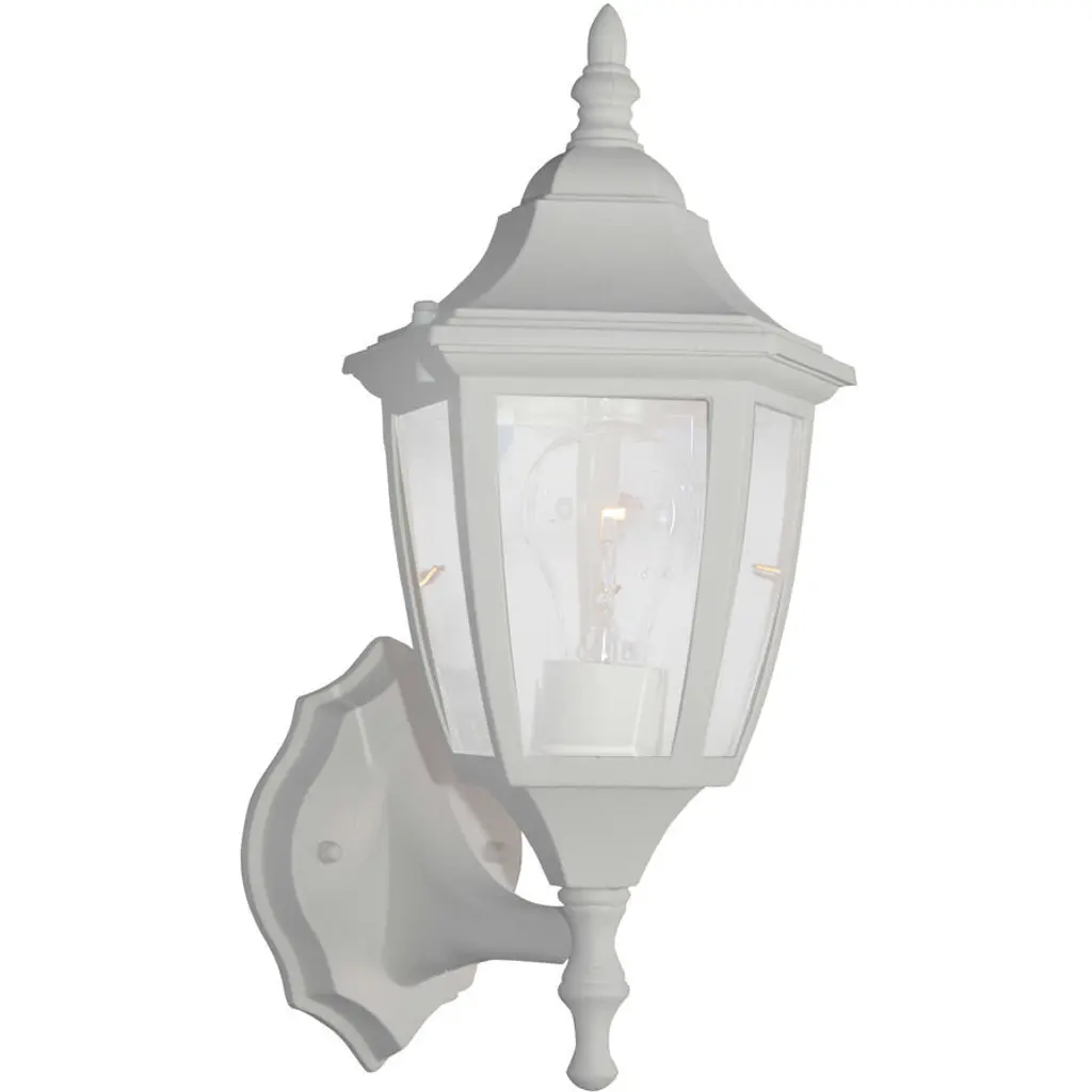 Waterbury outdoor lanterns feature a classic, elegant six sided design that complements the exterior decor of any home. The rounded clear glass works with the sharp lines and detailed backplate to provide a bold look from the fixture and a warm glow from the light. The solid white finish is treated to prevent pitting, tarnishing, corrosion and discoloration. The sturdy, weather resistant cast aluminum construction and waterproof seal protect the lantern from harsh outdoor elements to ensure the long life of the fixture. These outdoor lanterns install easily and deliver welcoming, safe and reliable exterior lighting.