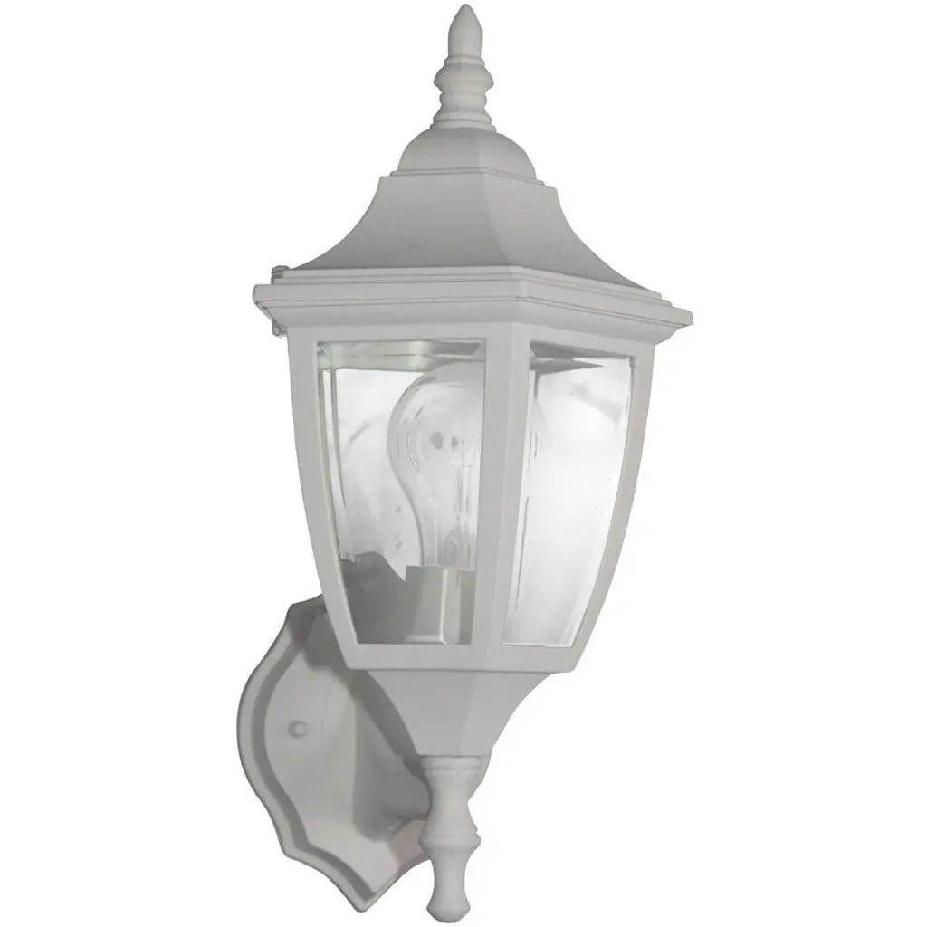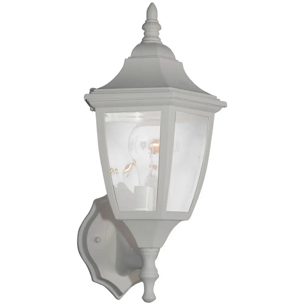 Waterbury outdoor lanterns feature a classic, elegant six sided design that complements the exterior decor of any home. The rounded clear glass works with the sharp lines and detailed backplate to provide a bold look from the fixture and a warm glow from the light. The solid white finish is treated to prevent pitting, tarnishing, corrosion and discoloration. The sturdy, weather resistant cast aluminum construction and waterproof seal protect the lantern from harsh outdoor elements to ensure the long life of the fixture. These outdoor lanterns install easily and deliver welcoming, safe and reliable exterior lighting.