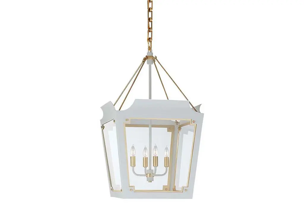 Designed by Julie Neill for Visual Comfort: This lantern is elegantly crafted of steel with a soft white finish and accented with golden details. Clear glass panels reveal four candelabra lights. Hardwired.