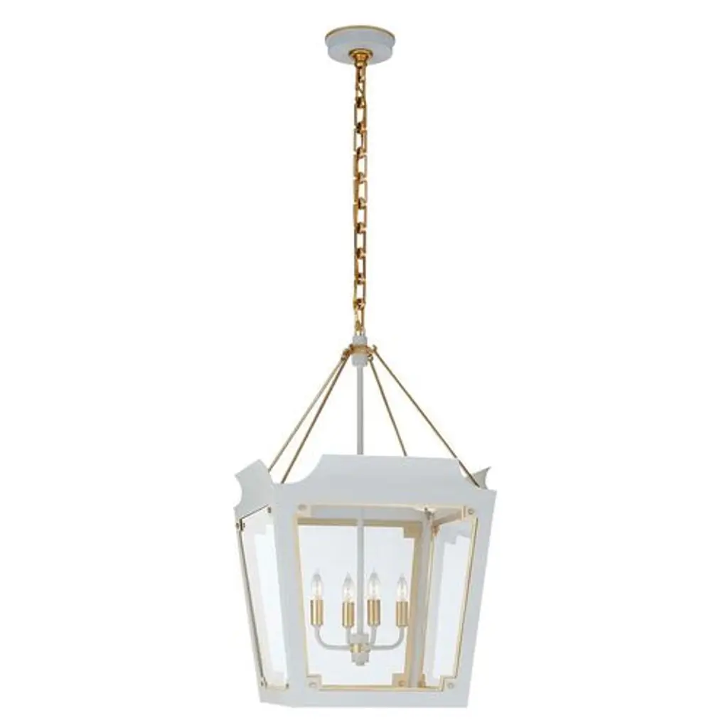 Designed by Julie Neill for Visual Comfort: This lantern is elegantly crafted of steel with a soft white finish and accented with golden details. Clear glass panels reveal four candelabra lights. Hardwired.