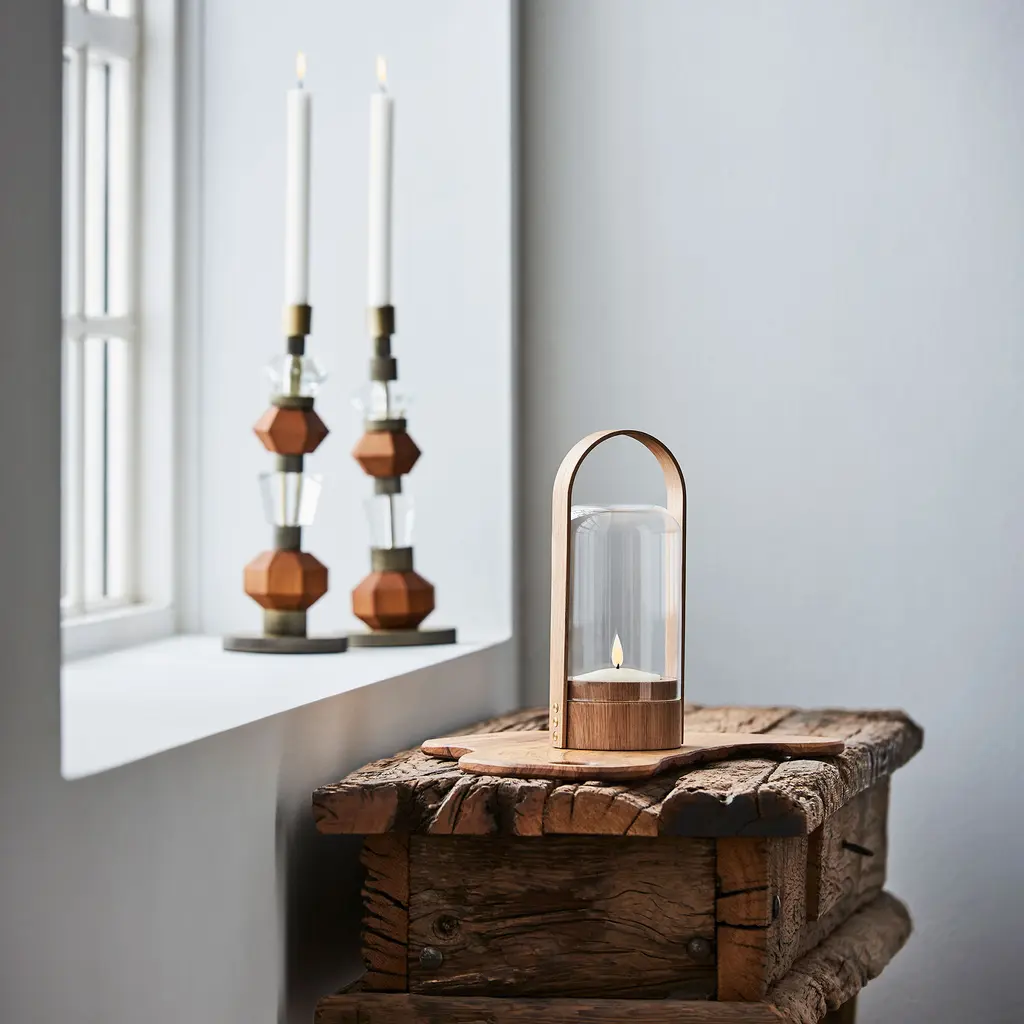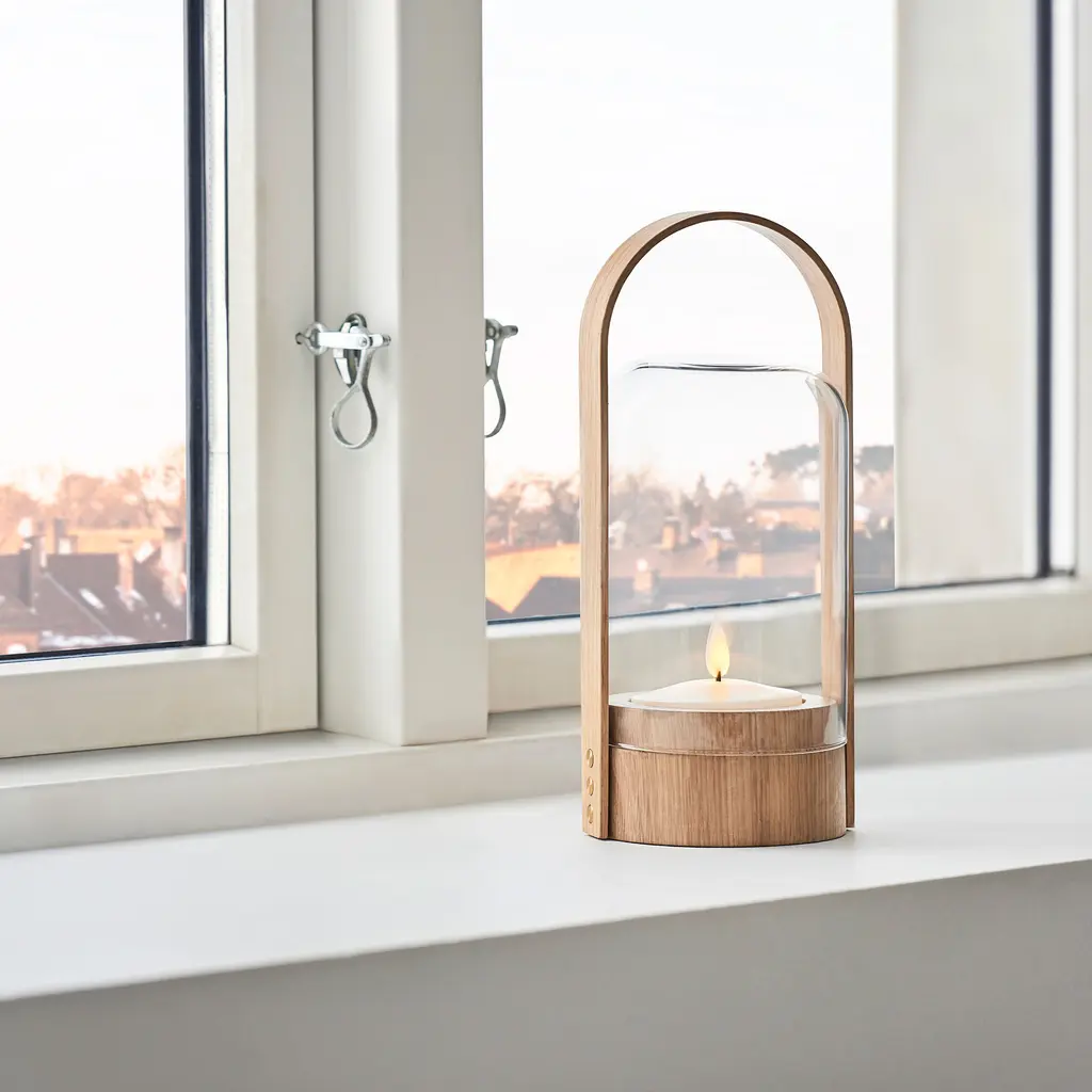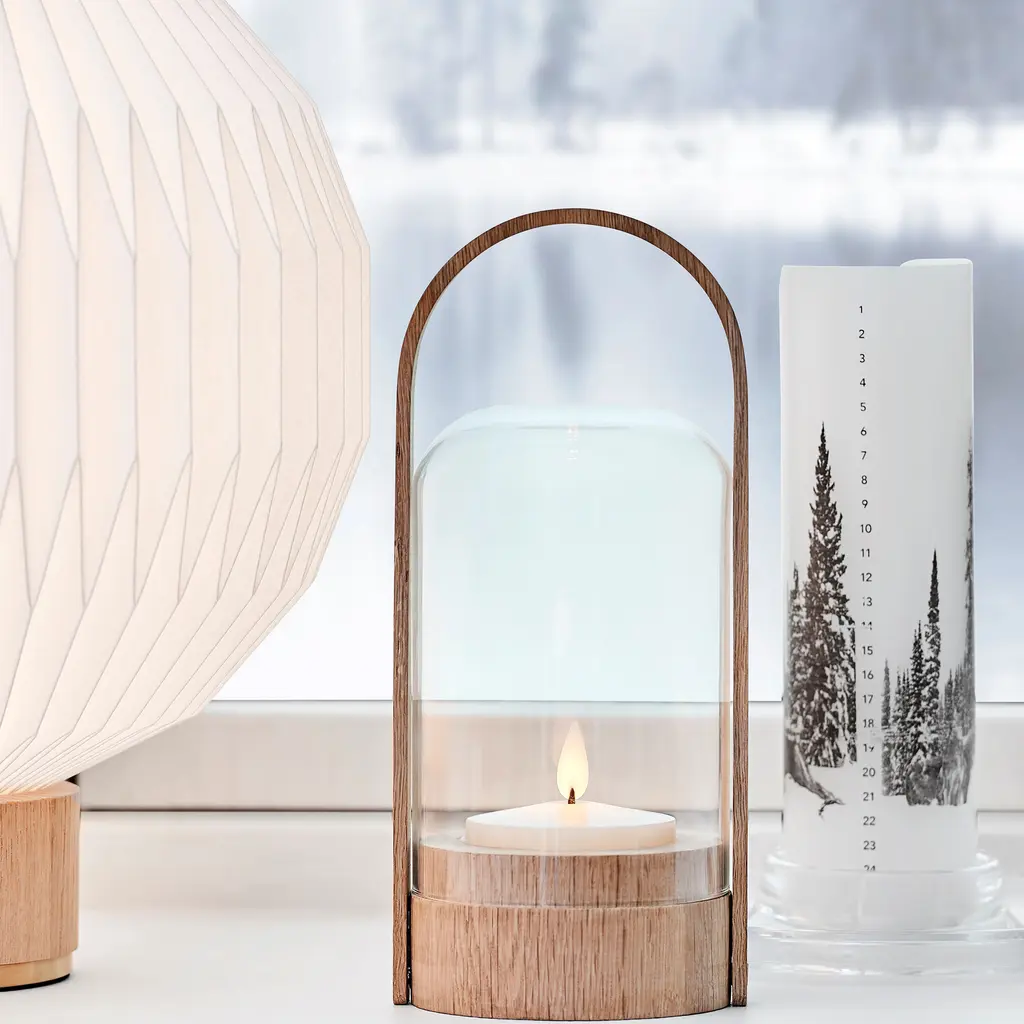 Enjoy the beauty of a lit candle without having to worry about soot, melted wax, or even candle replacements. Inspired by portable candle holders, the Candlelight Rechargeable LED Lantern pairs natural materials like wood, wax and glass with LED lighting technology. Philip Bro Ludvigsen designed this portable lamp for well-known Danish lighting brand Le Klint with a minimalist arched and rounded shape. The light oak base holds the wax candle with an integrated LED light that illuminates with a realistic flicker. A hand-blown glass dome covers the light, reminding of old lamps that protected the flames from gusts of wind. A curved wood handle offers a convenient way to move the lamp around the house, while a brass switch provides an easy solution to turn the light on and off. Easy to recharge as needed, the Le Klint Candlelight lantern has a discreet USB charging port.