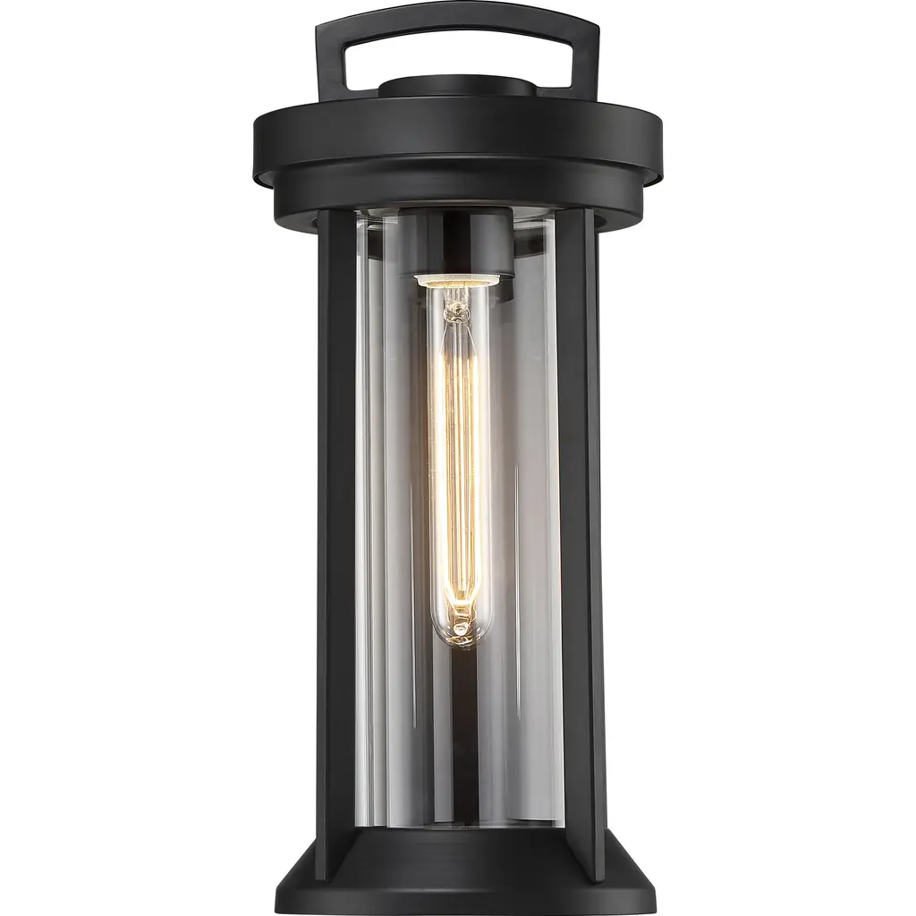 The Eastham one light outdoor wall fixture in textured black by Chapman & Myers is designed with an upright square metal crossbar which extends beyond the top and bottom of each light to both support and define each light. The crossbars intersect two stepped top & bottom metal rims and capture the cylindrical glass shade. Each is illuminated by a tubular filament bulb.
