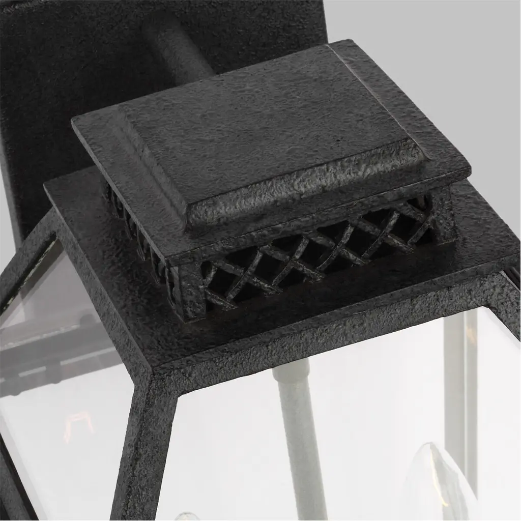 Falmouth by Chapman and Myers outdoor lighting design mimics a vintage gas lantern, with a classic, tapered box shape. The clean lines of the elegant frame have an uncluttered silhouette that showcases the beautiful panels of clear glass.