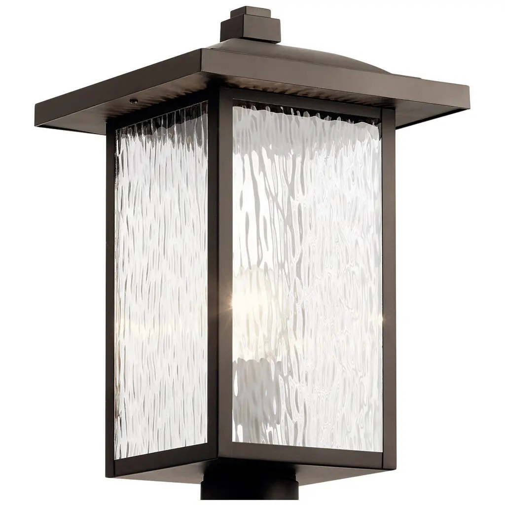 The 1-light outdoor post mount from the Capanna(TM) collection gives the classic lantern light a linear update. An Olde Bronze(R) finish and squared edges, including a capstone finial, combine with artful waterfall glass to create a style that works on homes with modern, transitional or arts & crafts architecture.