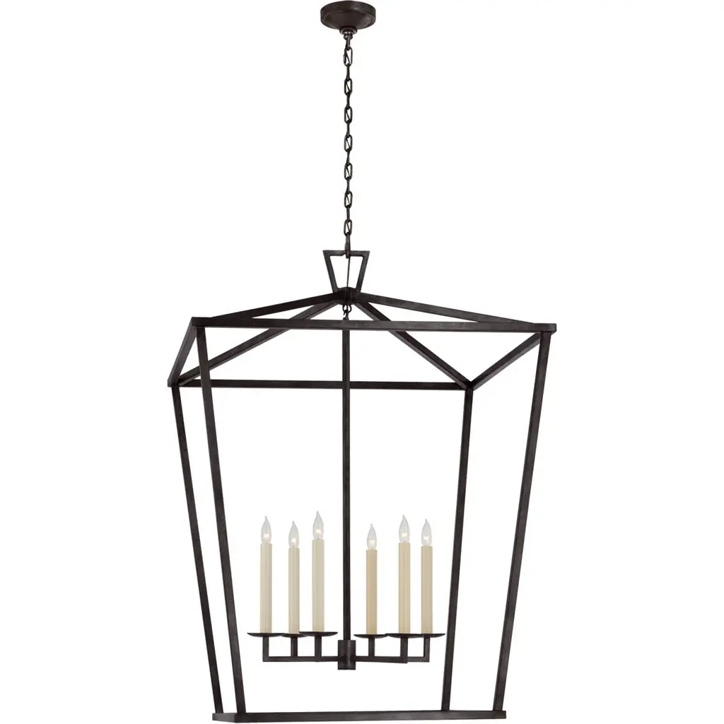The Cape Lantern wears a wonderfully distressed Blackened Iron finish with a stunning geometric silhouette frame. The candelabra lighting inside creates a rustic modern statement in your foyer, living room, or dining room.