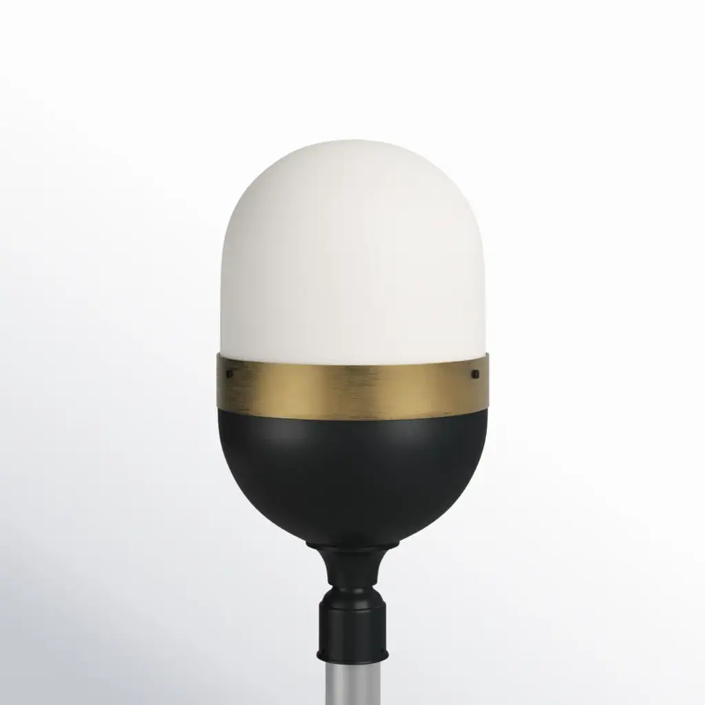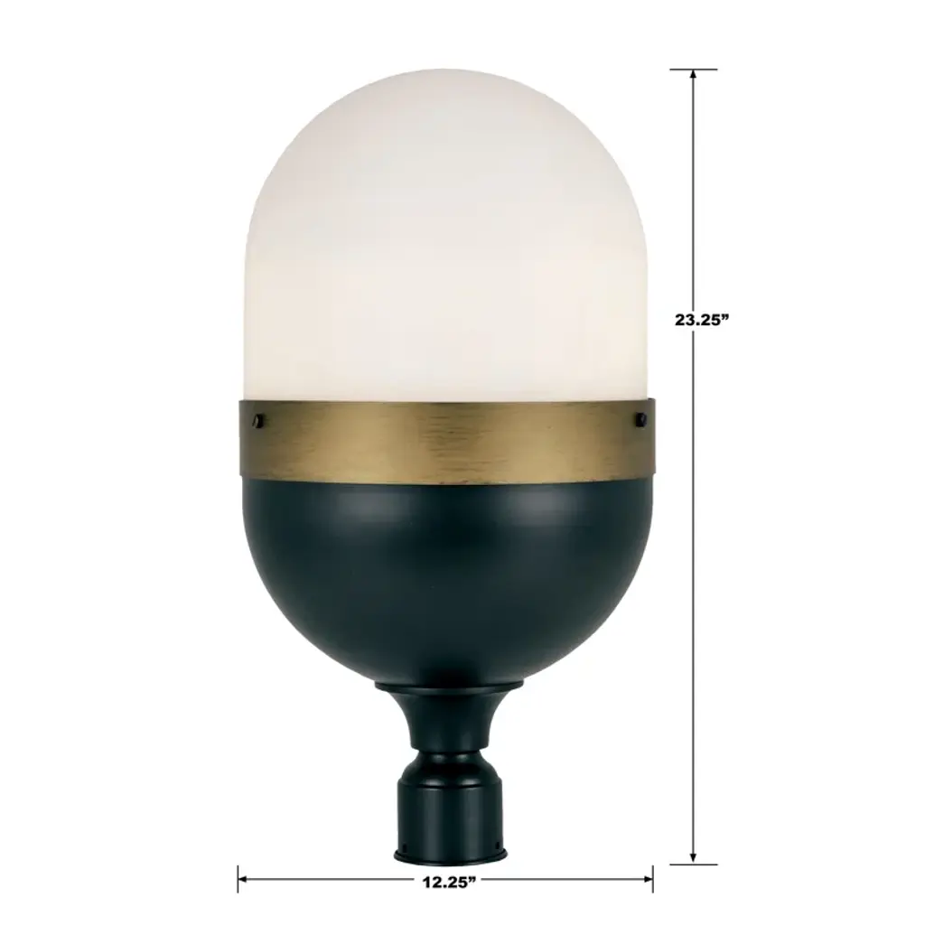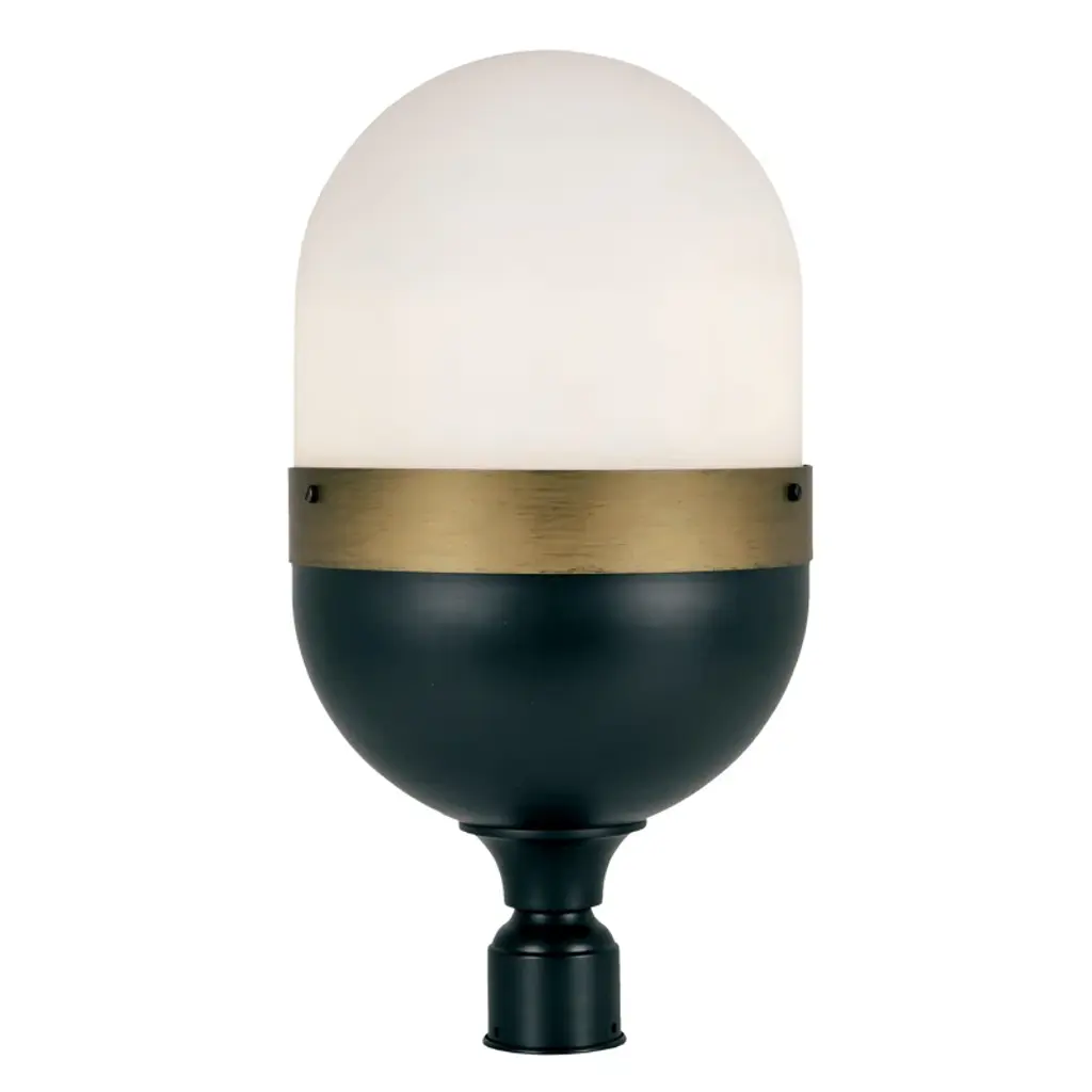 The Fairwinds XL outdoor post light is perfectly suited to driveways, walking paths, and strategically placed landscape venues, adding safety for visitors. An inner hand-shaped, slightly curved open aluminum structure surrounds the light and is encased in an extra-large, substantial clear glass shade.