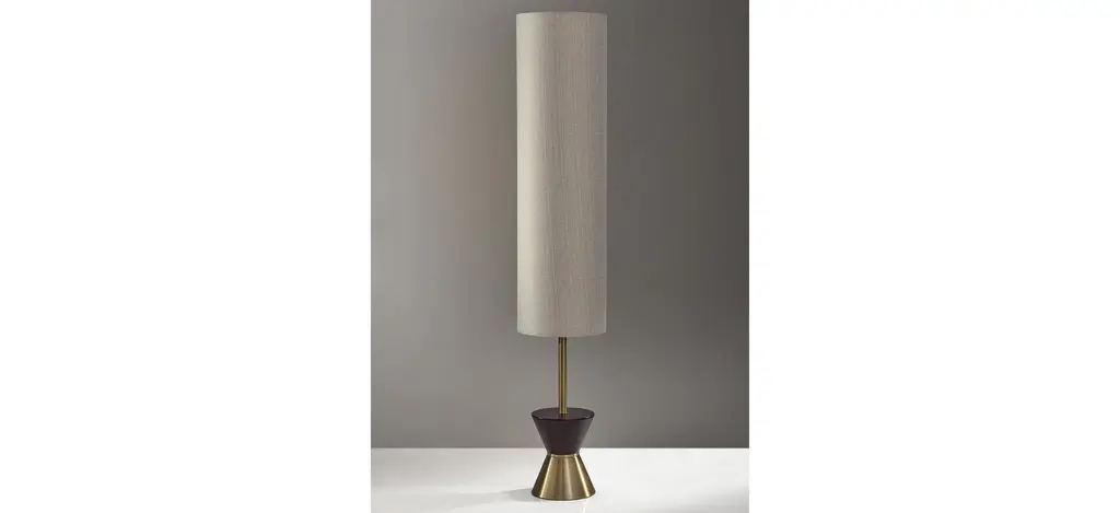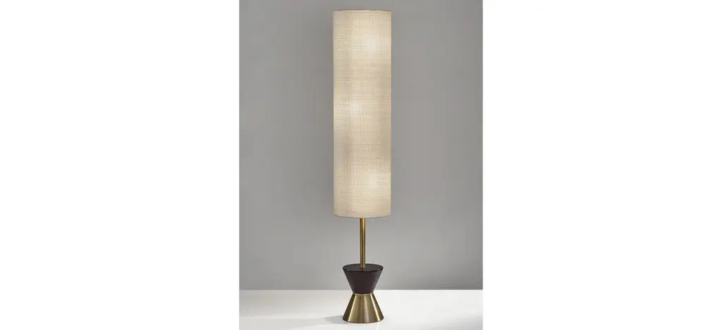 The Carmen Floor Lantern makes a strong statement in the living room. A mix of antique brass and walnut wood materials and an hourglass shaped base reveals mid-century modern style with retro influence. A textured beige tall fabric shade softens the look while three bulbs cast an even glow for the perfect mood lighting. A convenient foot step switch turns the lamp on and off.