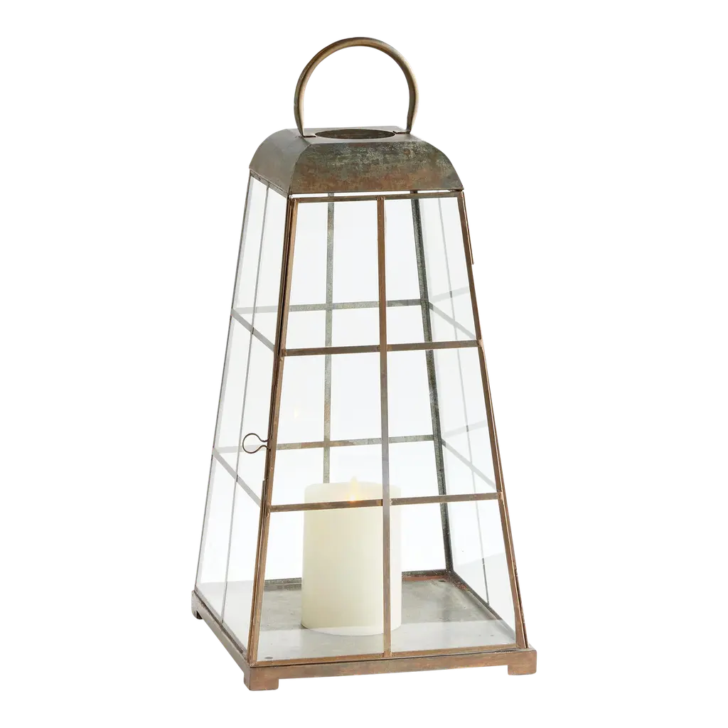 In a narrow, exaggerated shape and repeating brass pane design, this lantern has a mod feel. Scaled to add height, even when on the floor. The candlelight plays off the warm brass creating a magical ambiance.