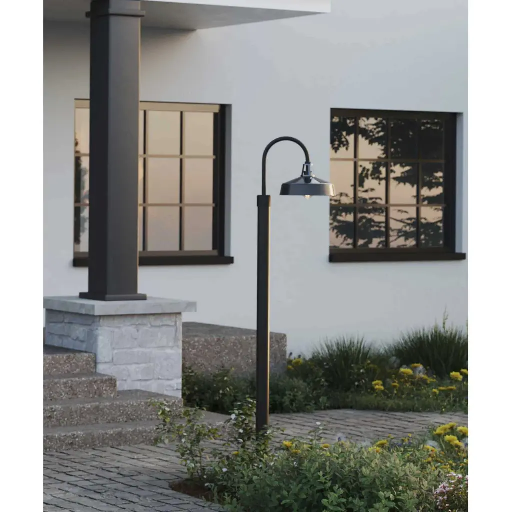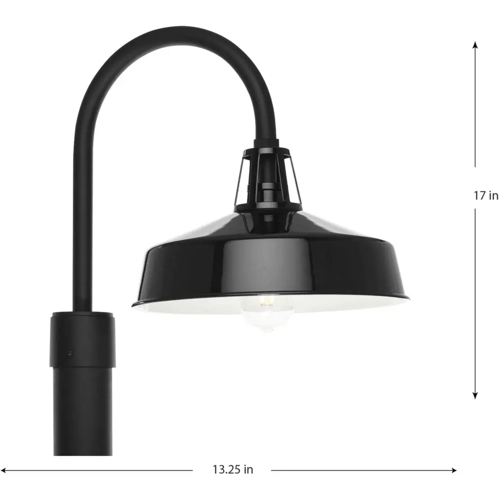 A fun take on the traditional warehouse shade, Cedar Springs can be a stylish addition to any indoor or outdoor space. Offered in a generous size and featuring a black gooseneck arm style and black shade, this classic Farmhouse fixture serves as an eye-catching addition to a variety of facades. Dark Sky Friendly.