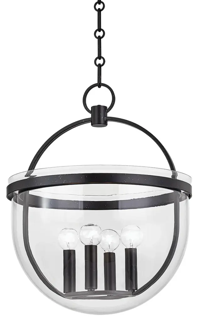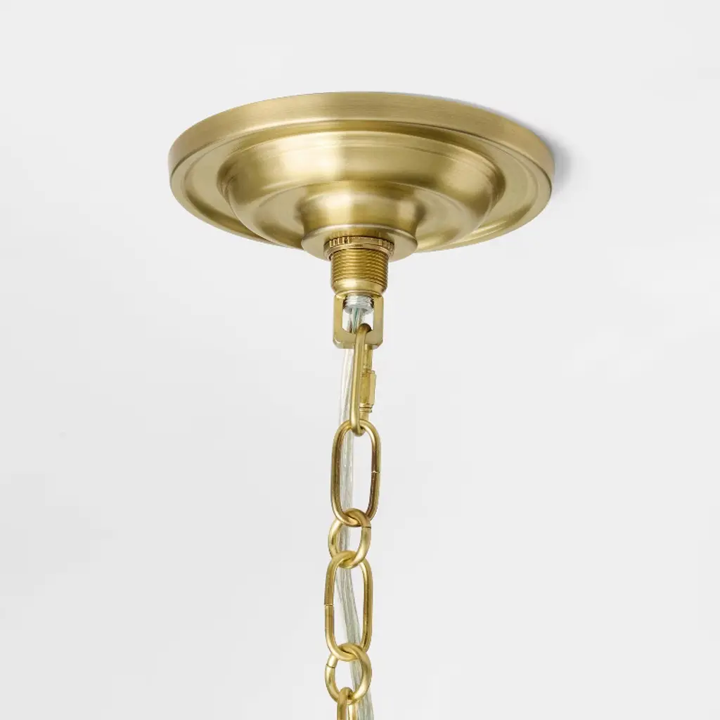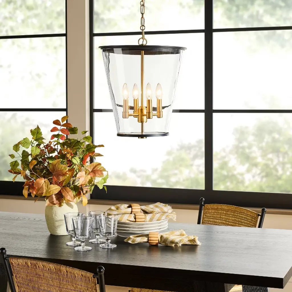 This Ceiling Lantern from Threshold™ designed with Studio McGee provides a graceful glow over your dining room or kitchen island while showing off a sleek two-tone metal design. Crafted from metal, this decorative ceiling light showcases a tapered lampshade with a clear glass body and black metal frame. It has a classic gold-tone candelabra base inside featuring four candlestick holders and their corresponding bulbs (sold separately). The pendant light hangs with the help of a height-adjustable chain in a gold finish with a complementary ceiling fixture.Threshold™ designed with Studio McGee: Looks like home, feels like you.
