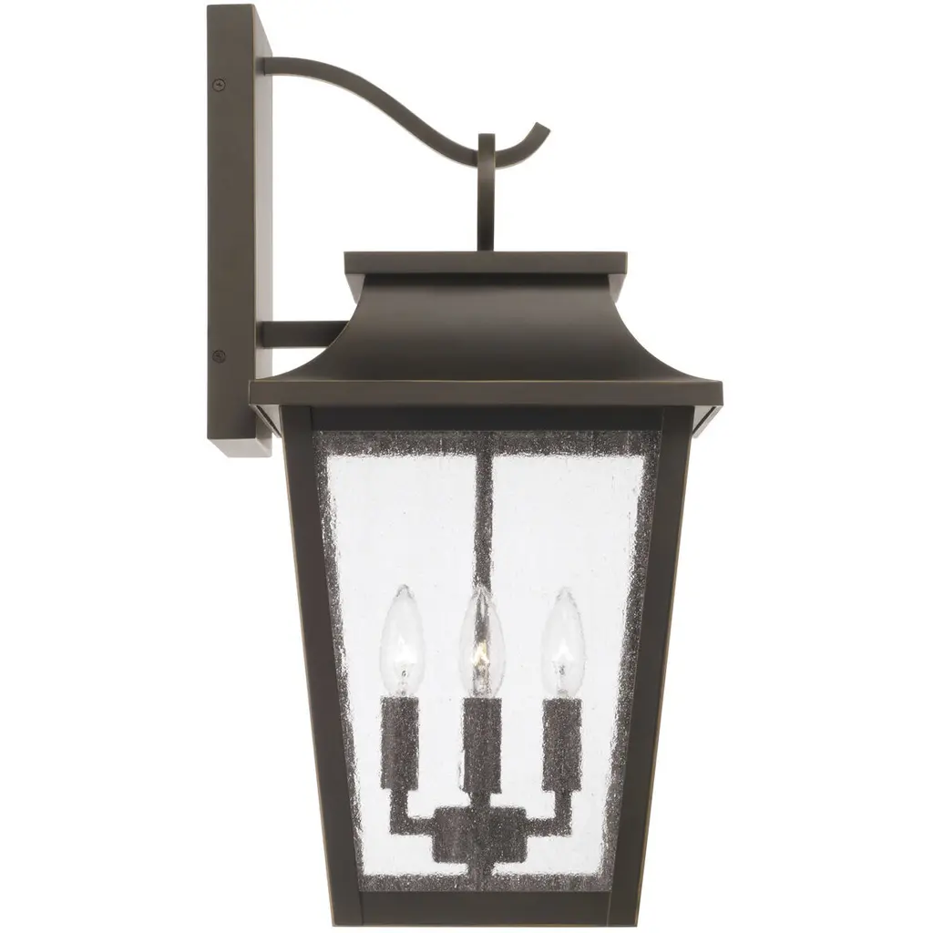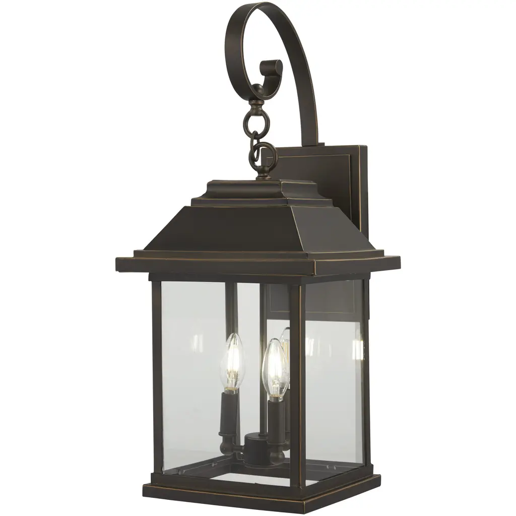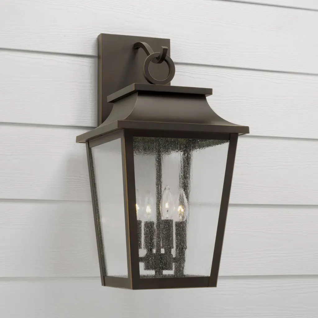 Take the charm outside with the Chandler Outdoor Wall Lantern. The Oiled Bronze finish accents the curved lines and ring detail atop the tapered frame, while the Antiqued Glass creates a unique glow. Part of our Rain or Shine Series and backed by our five-year warranty.