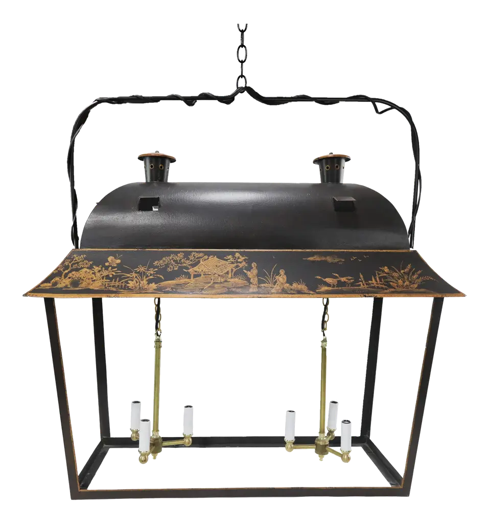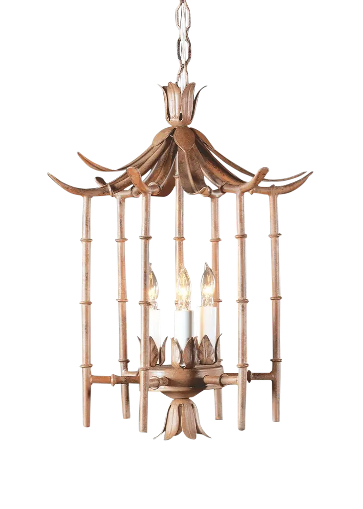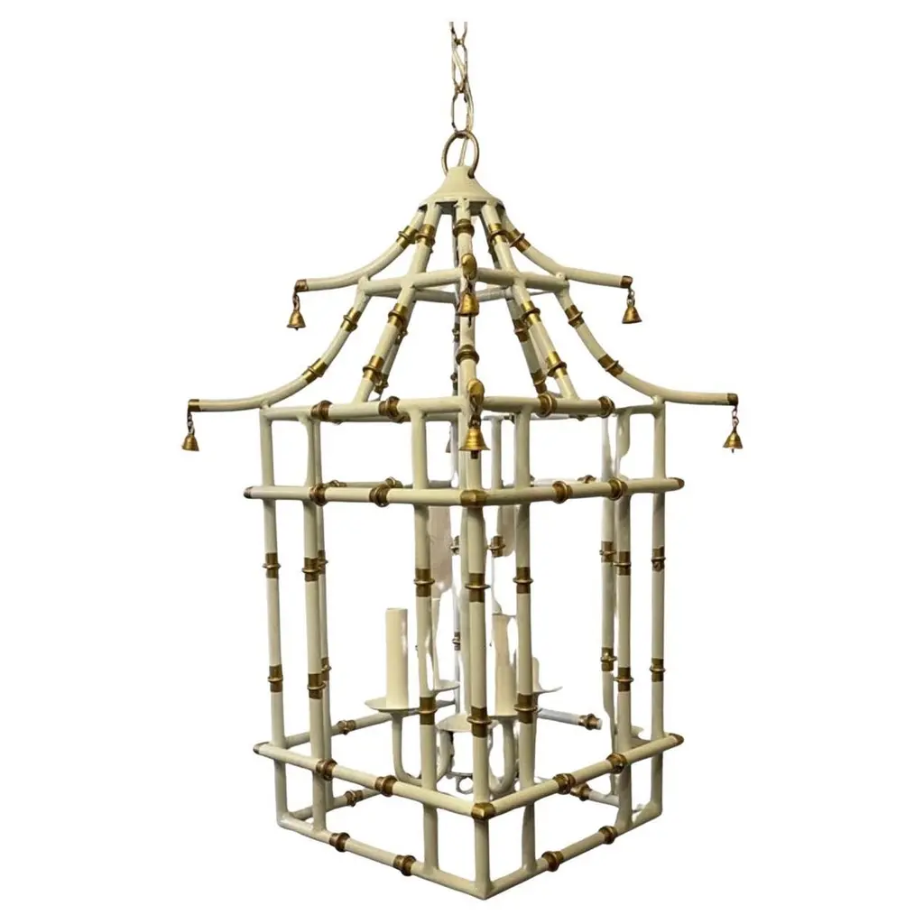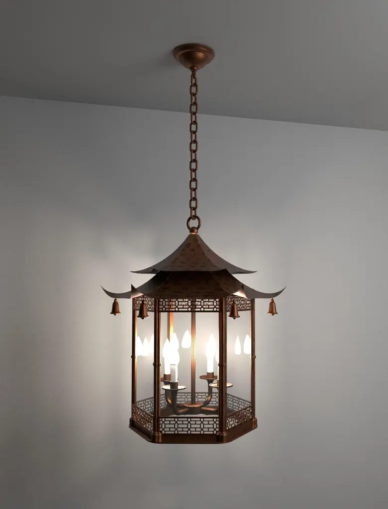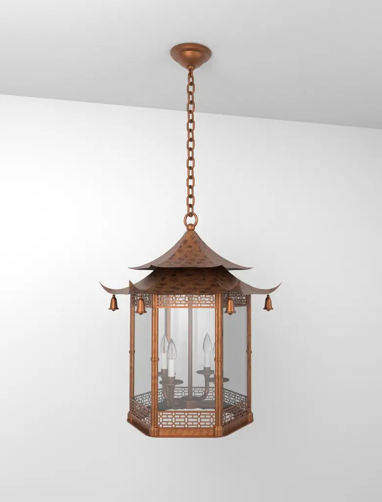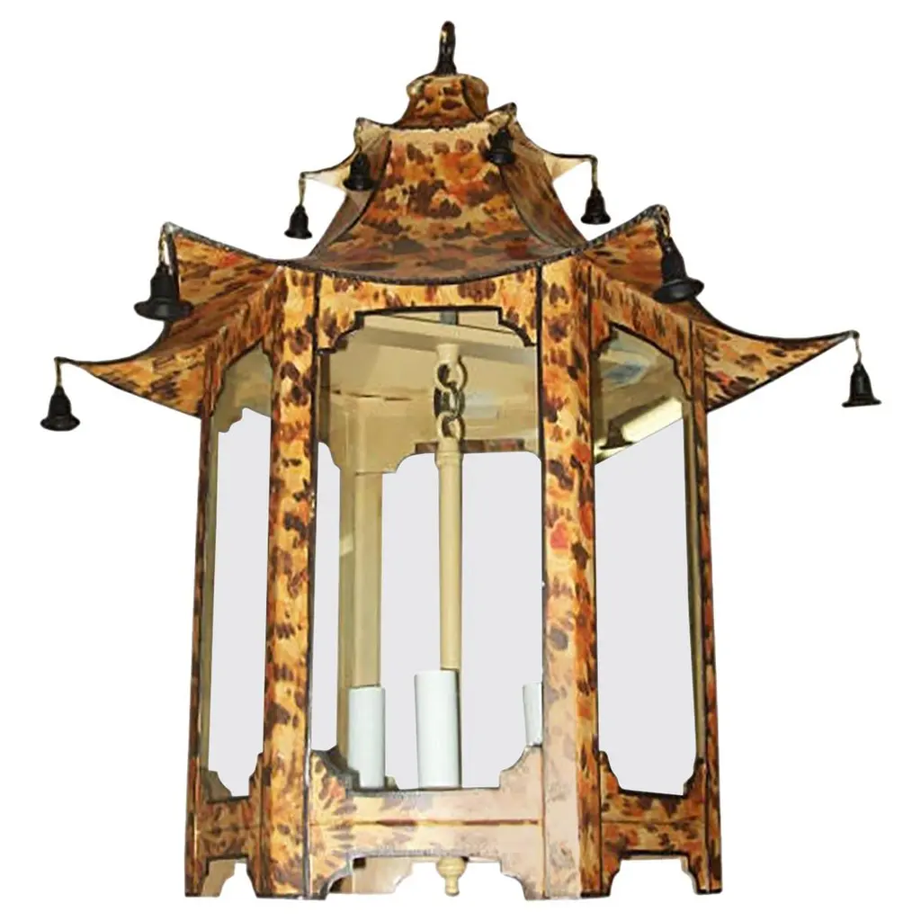 The Chanteloup Lantern by David Duncan Lighting. This artisan crafted, six-sided hanging lantern has been designed in an elegant style. The Chanteloup Lantern features a geometric gate design which frames each side, along with clustered brass columns with a bamboo motif, and a pointed, two-tiered roof. This light features an intricately painted tortoiseshell finish, which highlights the exquisite attention to detail in David Duncan's custom lighting line.Featuring four candelabra sockets. This fixture is available in custom painted finishes, as well as custom sizing to accommodate any luxury living space.Founded in 1989, David Duncan is a trusted design resource for custom and ready-made luxury lighting. Our bespoke program offers myriad fabrication and finish possibilities. Produced in the New York area, our designs blend cutting edge technology with traditional, handcrafted artisan techniques. David Duncan offers a dynamic assortment of pieces for today’s luxury interiors, and can accommodate custom projects of any scale.