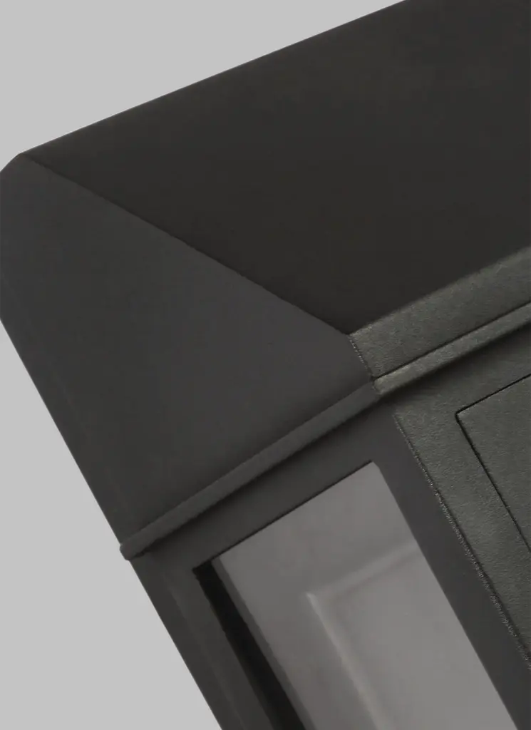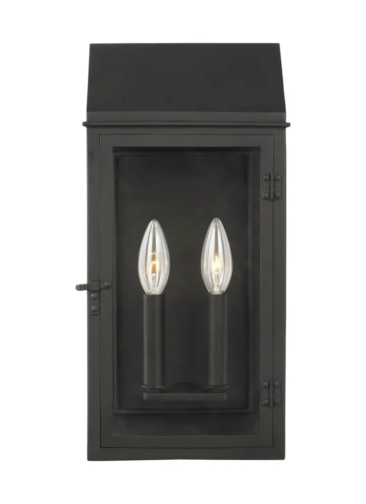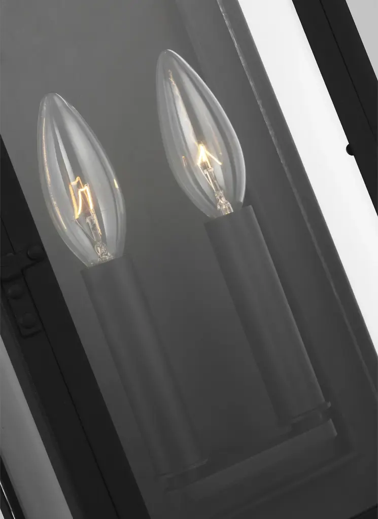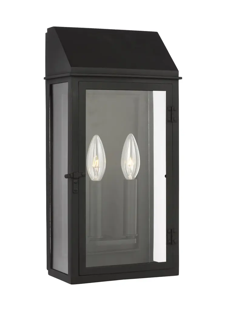 The Hingham outdoor family by Chapman & Myers is crafted of steel with a clear glass front, textured black finish and black candle tubes. Available in three size options . Designer: Chapman & Myers Extension: 4 7/8 Backplate: DP:5/8'' W:7 1/8'' H:12'' OB UP:9 5/8'' Rectangular Shade/Glass: clear glass panel and clear glass panels Lamping: 2 Torpedo Candelabra 25 watt light bulbs Voltage: 120 Bulb Included: No Safety Rating Location: wet