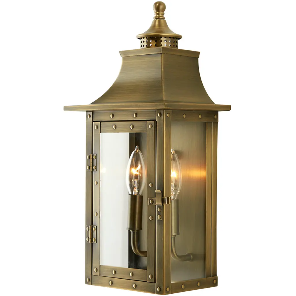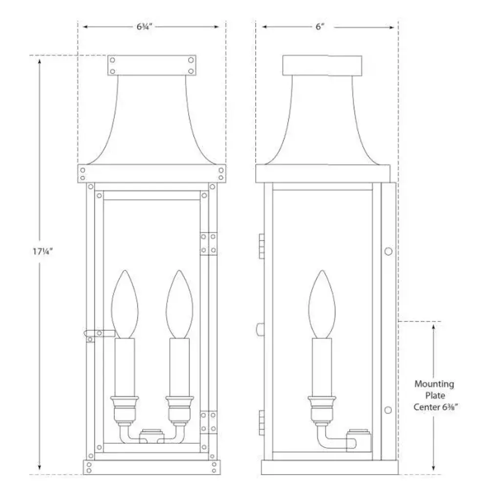Bedford Medium 3/4 Lantern in Natural Copper Designer: Chapman & Myers Height: 17.25" Extension: 6" Backplate: 5.25" x 8.75" Rectangle Mounting: Hardwire Shade Detail: Clear Glass Socket: 2 - E12 Candelabra Wattage: 2 - 60 C11 Safety Rating Location: WET