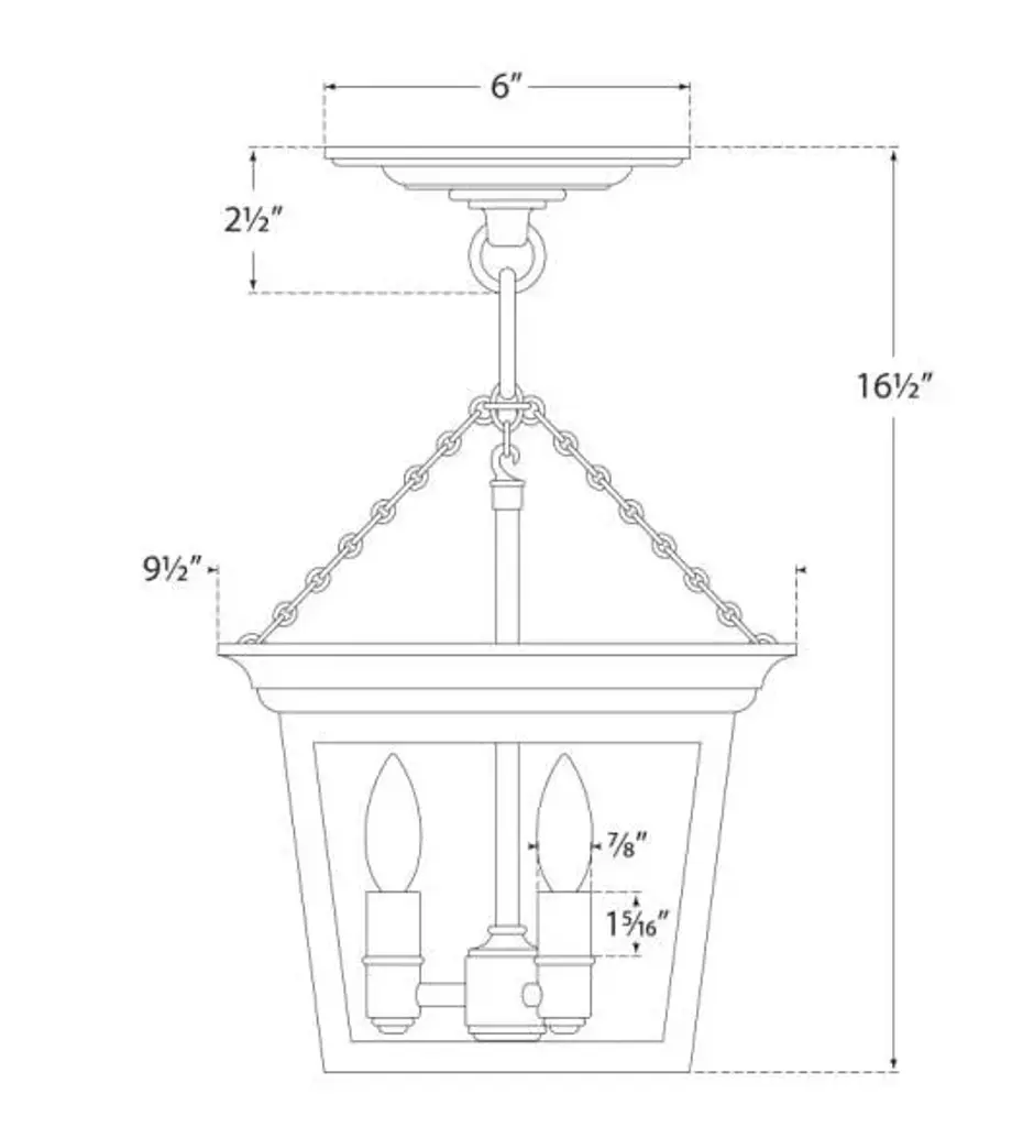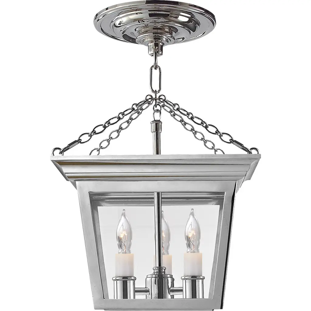Cornice Semi-Flush Lantern in Polished Nickel Designer: Chapman & Myers O/A Height: 16.5" Canopy: 6" Round Mounting: Semi-Flush Shade Detail: Clear Glass Socket: 3 - E12 Candelabra Wattage: 3 - 60 C11 Safety Rating Location: DAMP